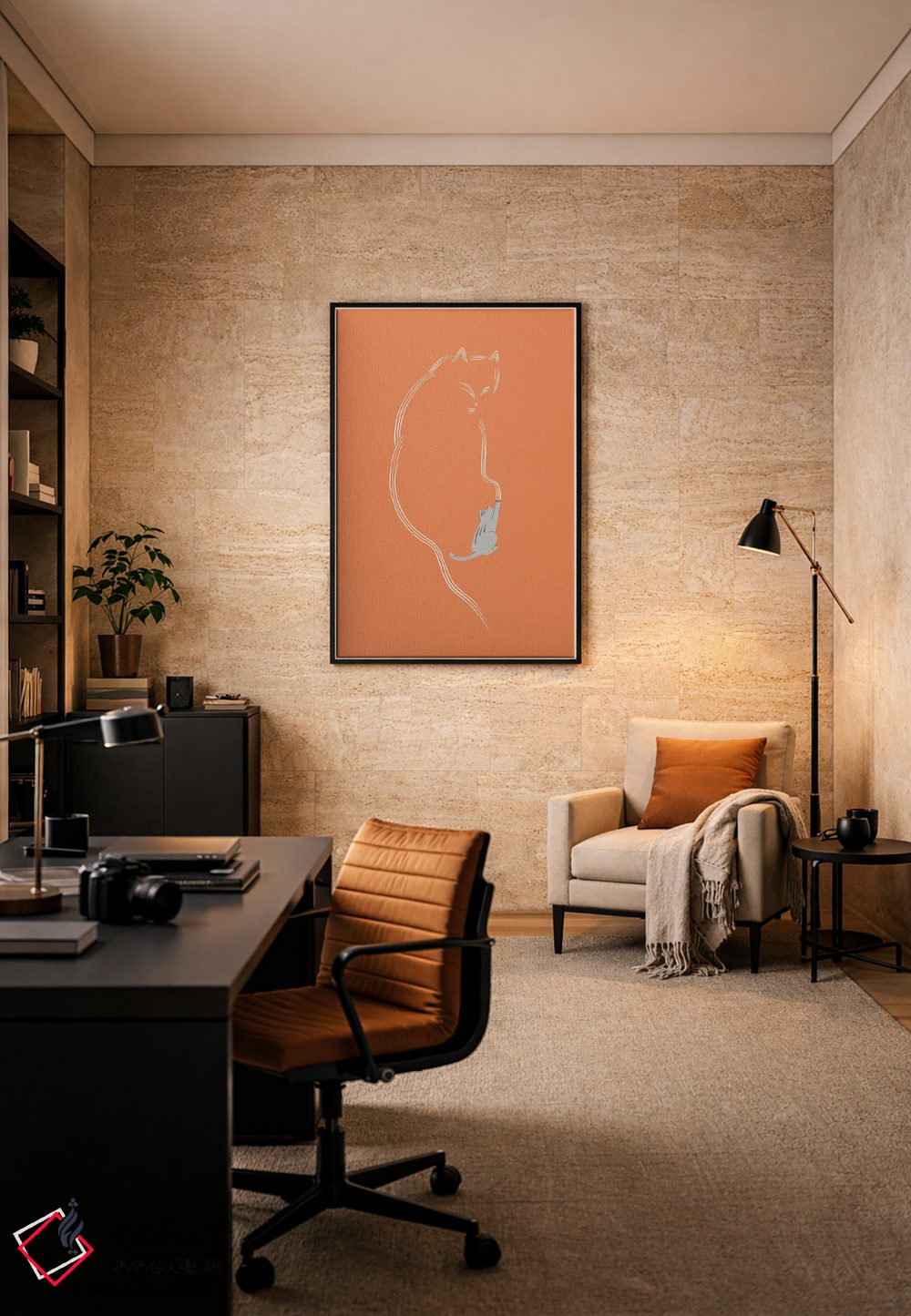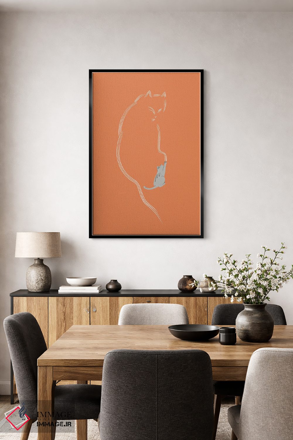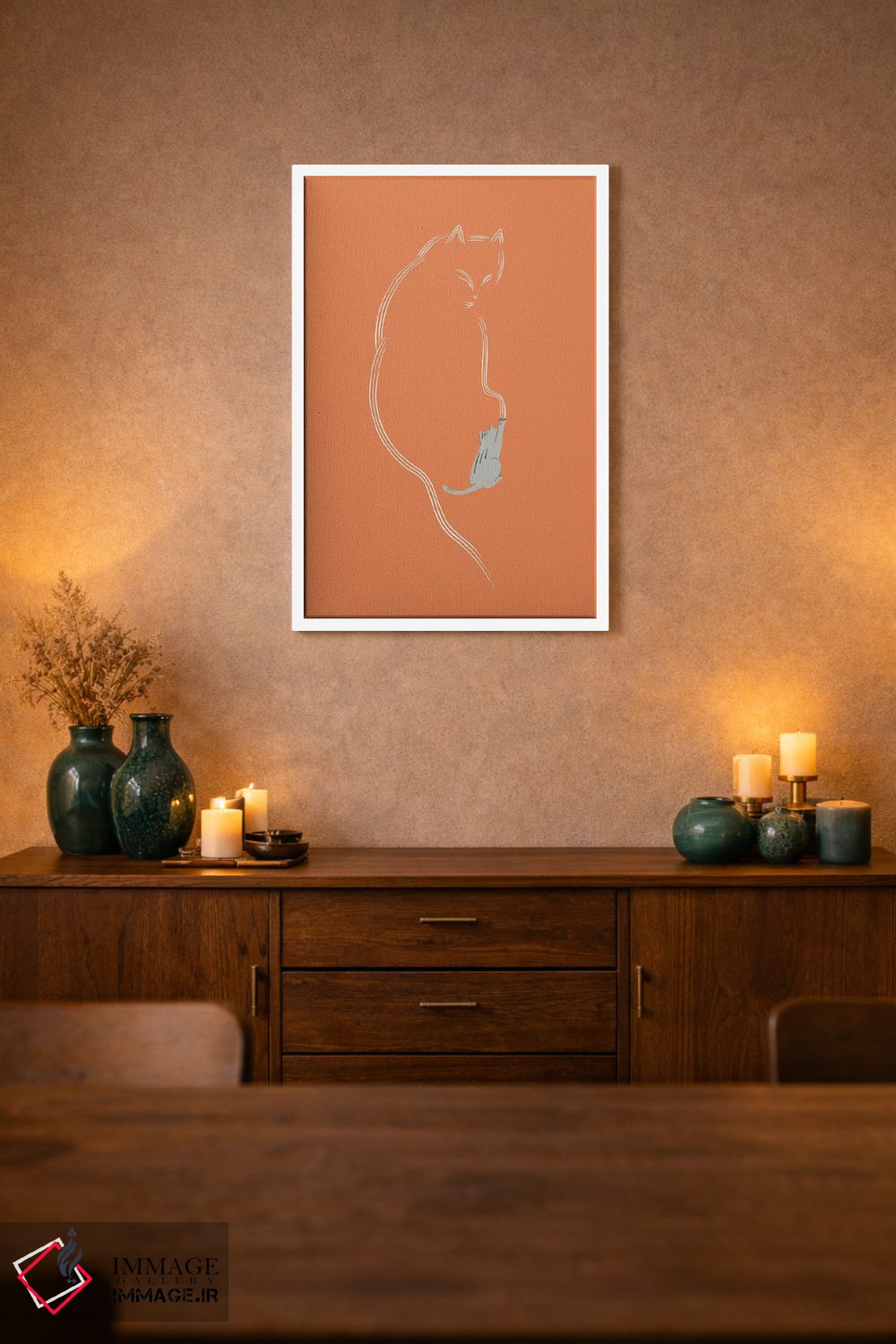 «گربه هنرمند» اثرِ «لیم هنگ سوی» از آن کارهاییست که در کنار رنگهای خنثی، تضاد دلچسبی میسازد؛ برای کافههای کوچک و صمیمی انتخاب خوبیست. با قاب چوبی یا مشکی، حس مرتبتری پیدا میکند.