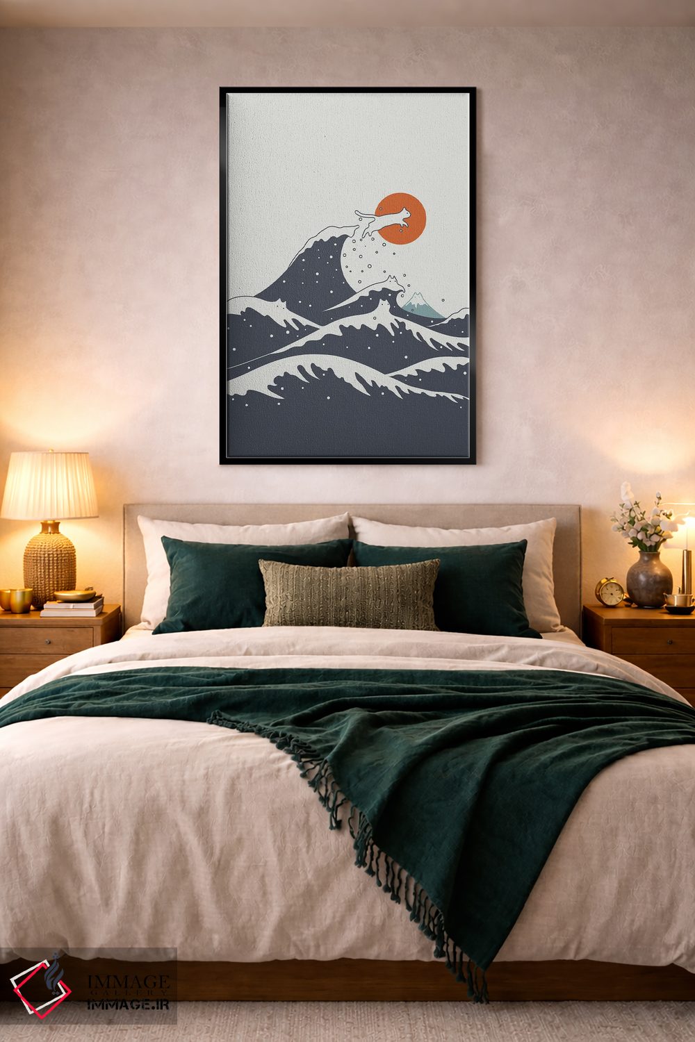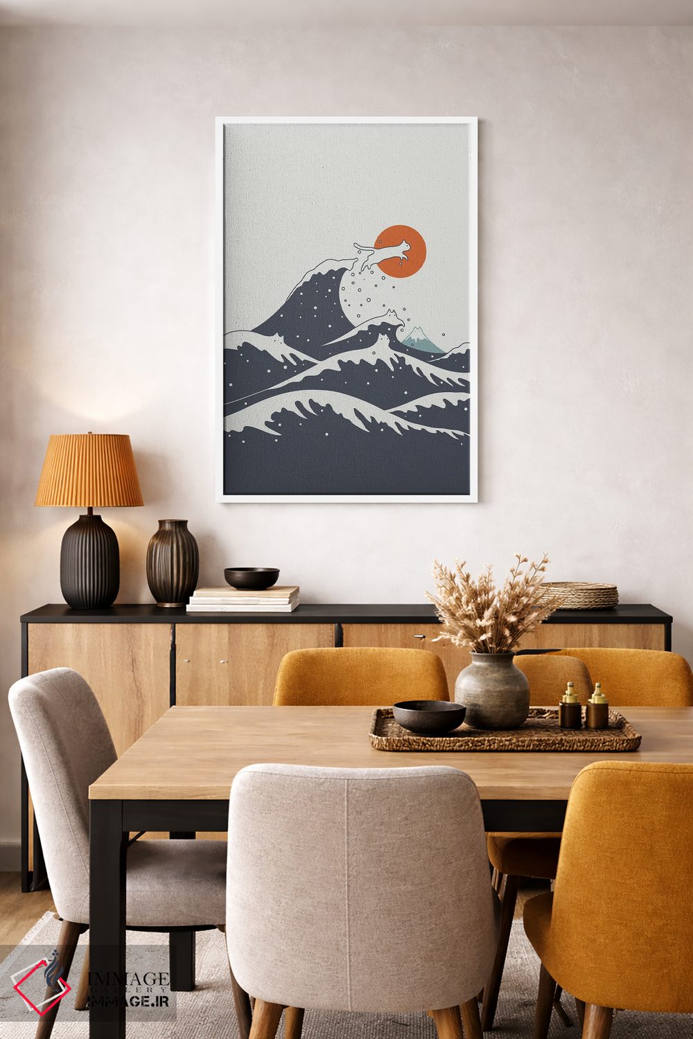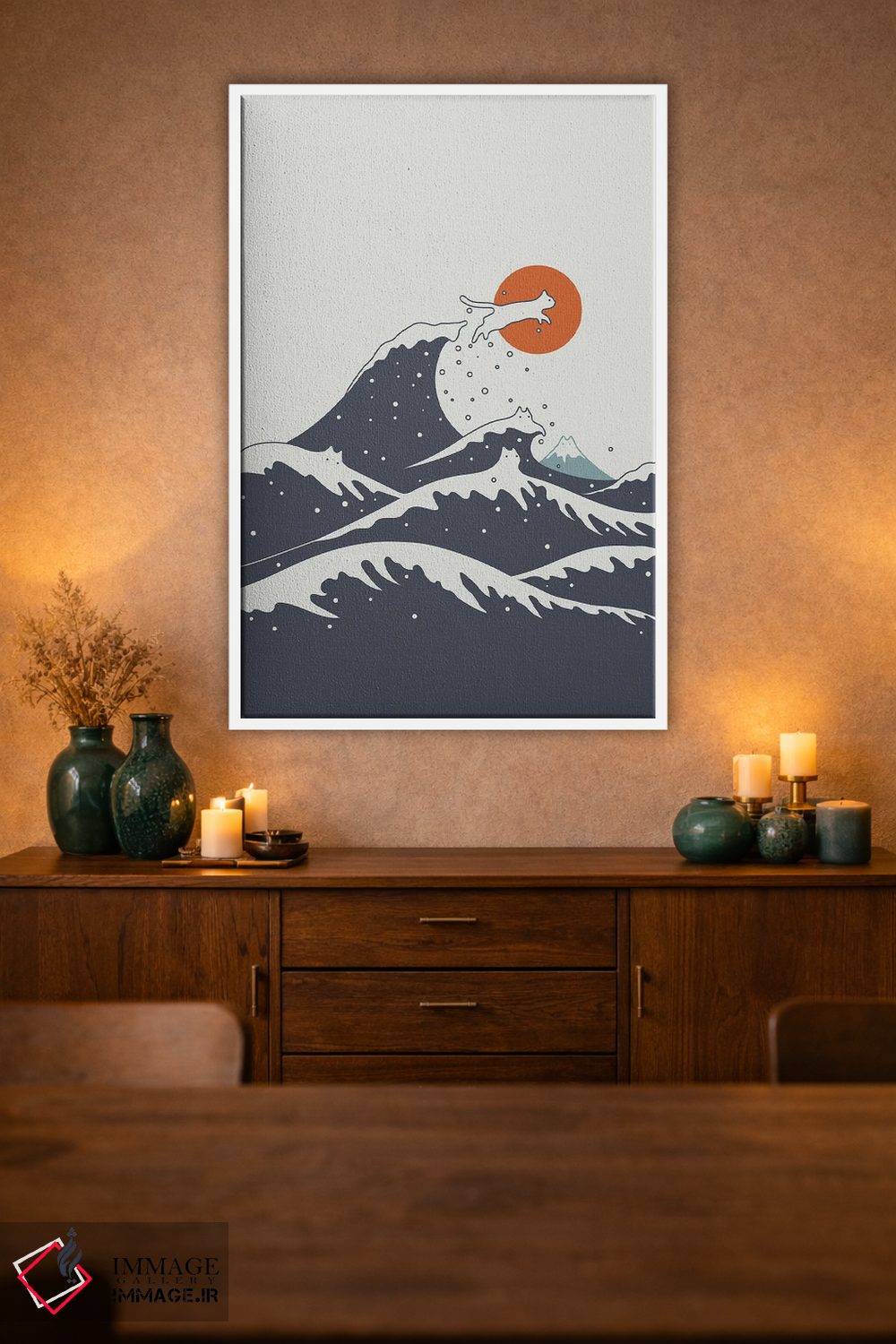 براساس پالت گرم اثر، قاب تیک گرم (چوبی) پیشنهاد اول است و مشکی مات (فریم متوسط) مکمل. برای سفارشهای پروژهای با ابعاد و قابهای اختصاصی با ایماژ در تماس باشید.