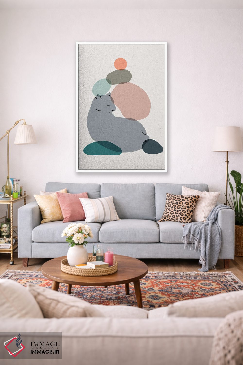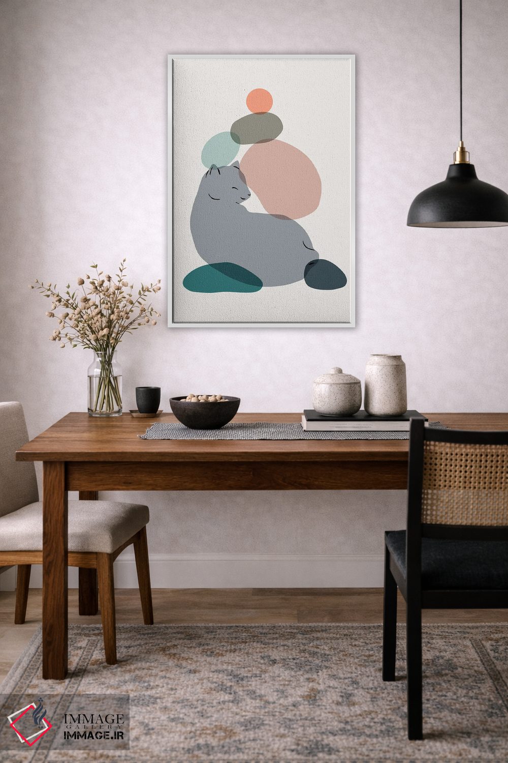 برای دکورهای صمیمی، «منظرهٔ گربه شماره ۶۰» اثرِ «لیم هنگ سوی» در کنار رنگهای خنثی، تضاد دلچسبی میسازد؛ برای دکورهای مدرن و مینیمال انتخابی خوشسلیقه است. در کنار گیاهان و نور طبیعی، جذابتر هم میشود.