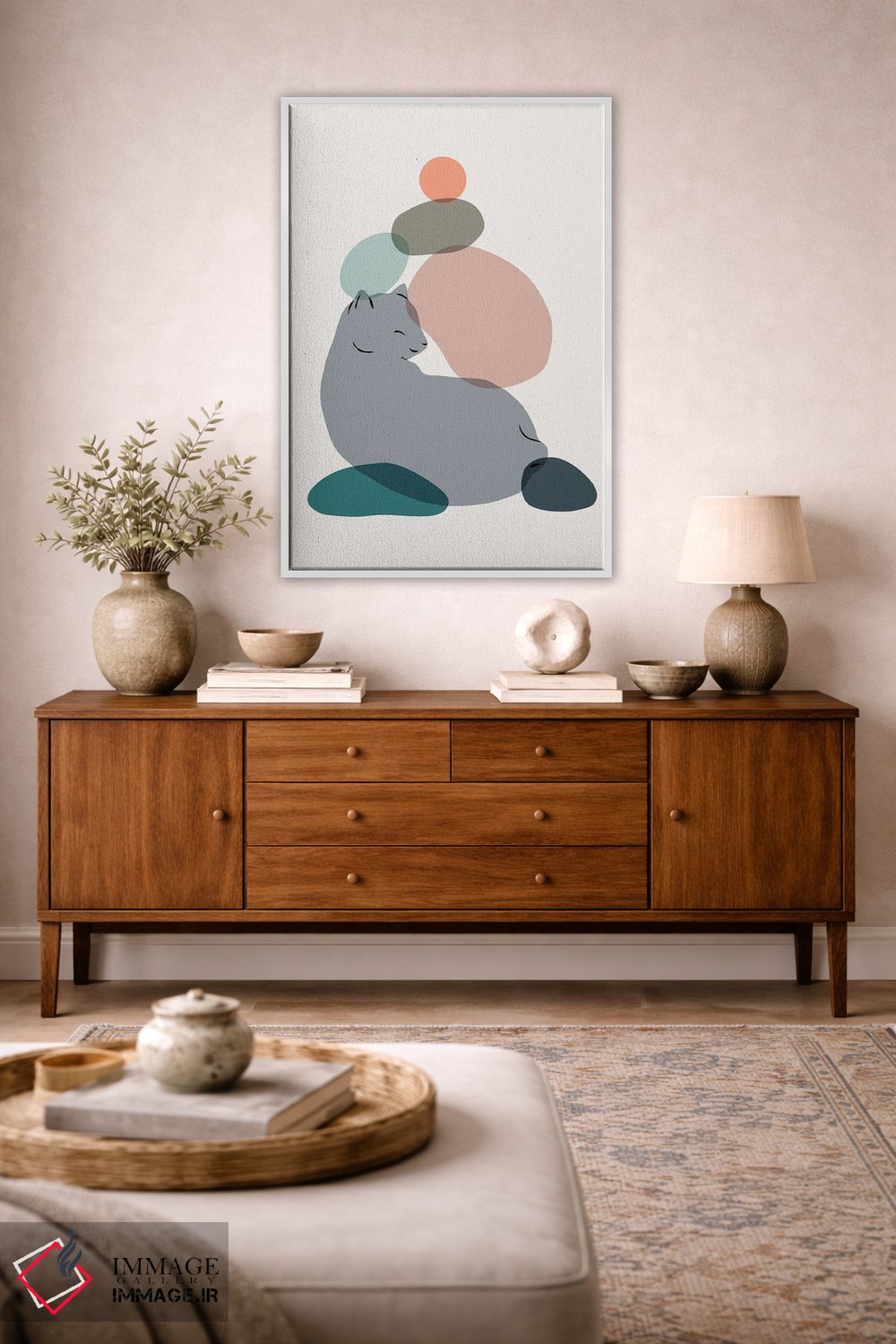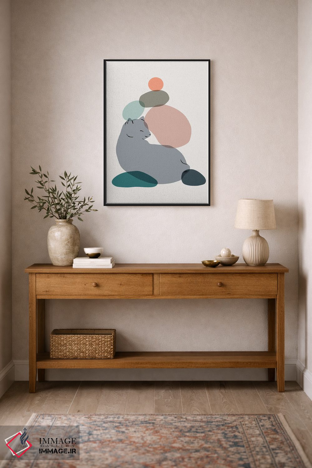 براساس پالت ترکیبی اثر، قاب بلوط روشن (چوبی) پیشنهاد اول است و استخوانی ملایم مکمل. برای سفارشهای پروژهای با ابعاد و قابهای اختصاصی با ایماژ در تماس باشید.