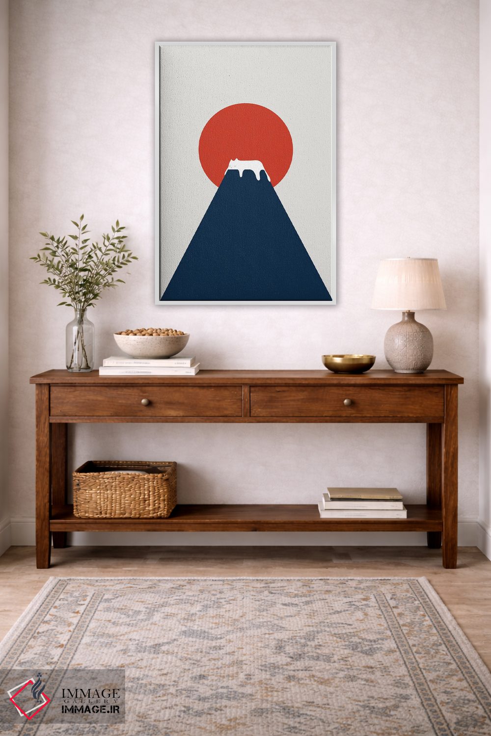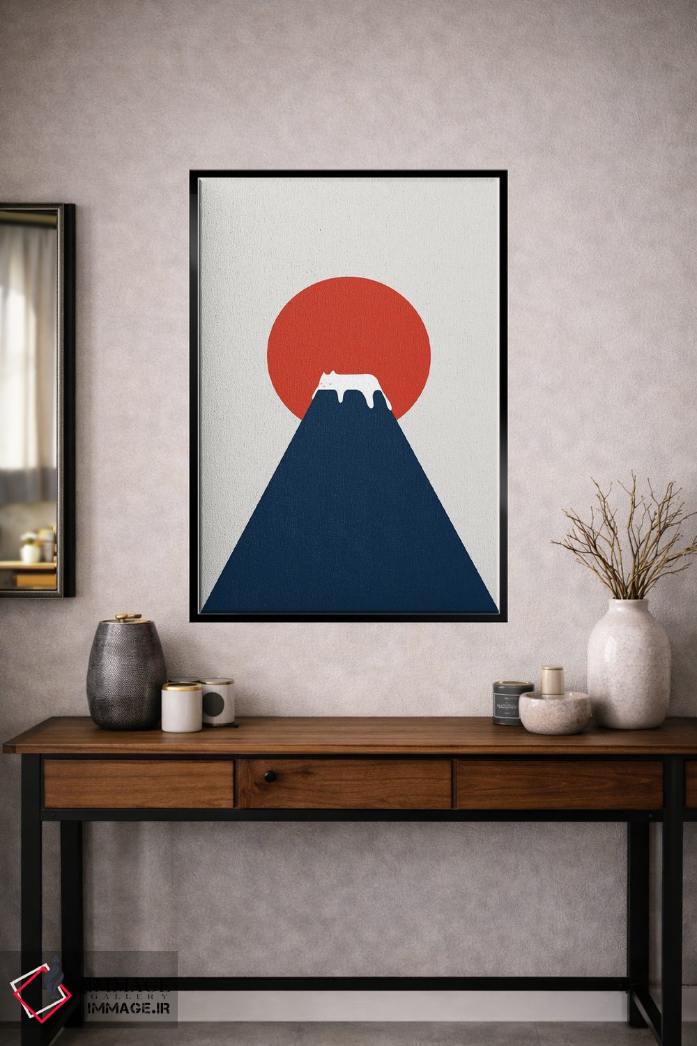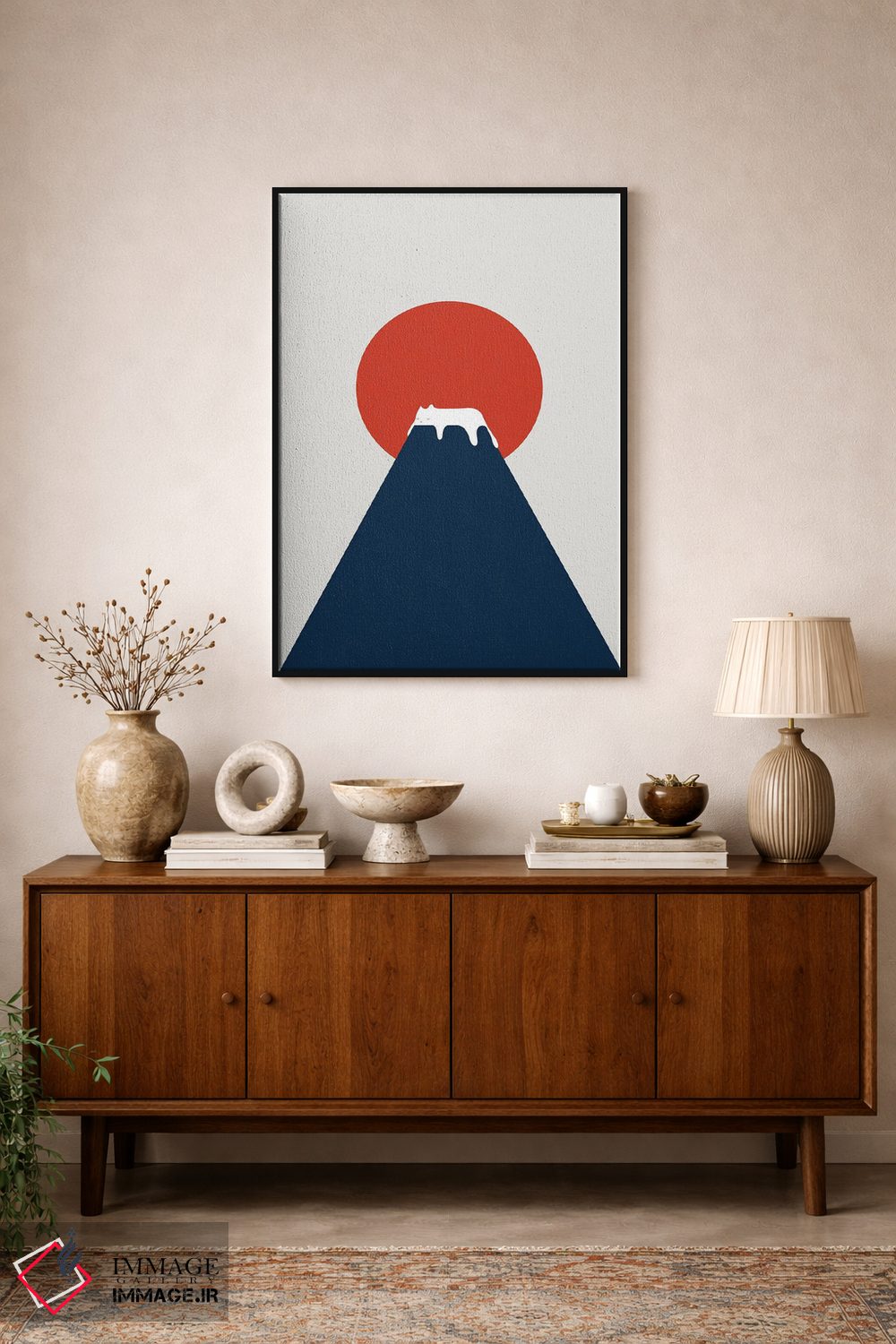 براساس پالت ترکیبی اثر، قاب تیک گرم (چوبی) پیشنهاد اول است و مشکی مات (فریم متوسط) مکمل. برای سفارشهای پروژهای با ابعاد و قابهای اختصاصی با ایماژ در تماس باشید.