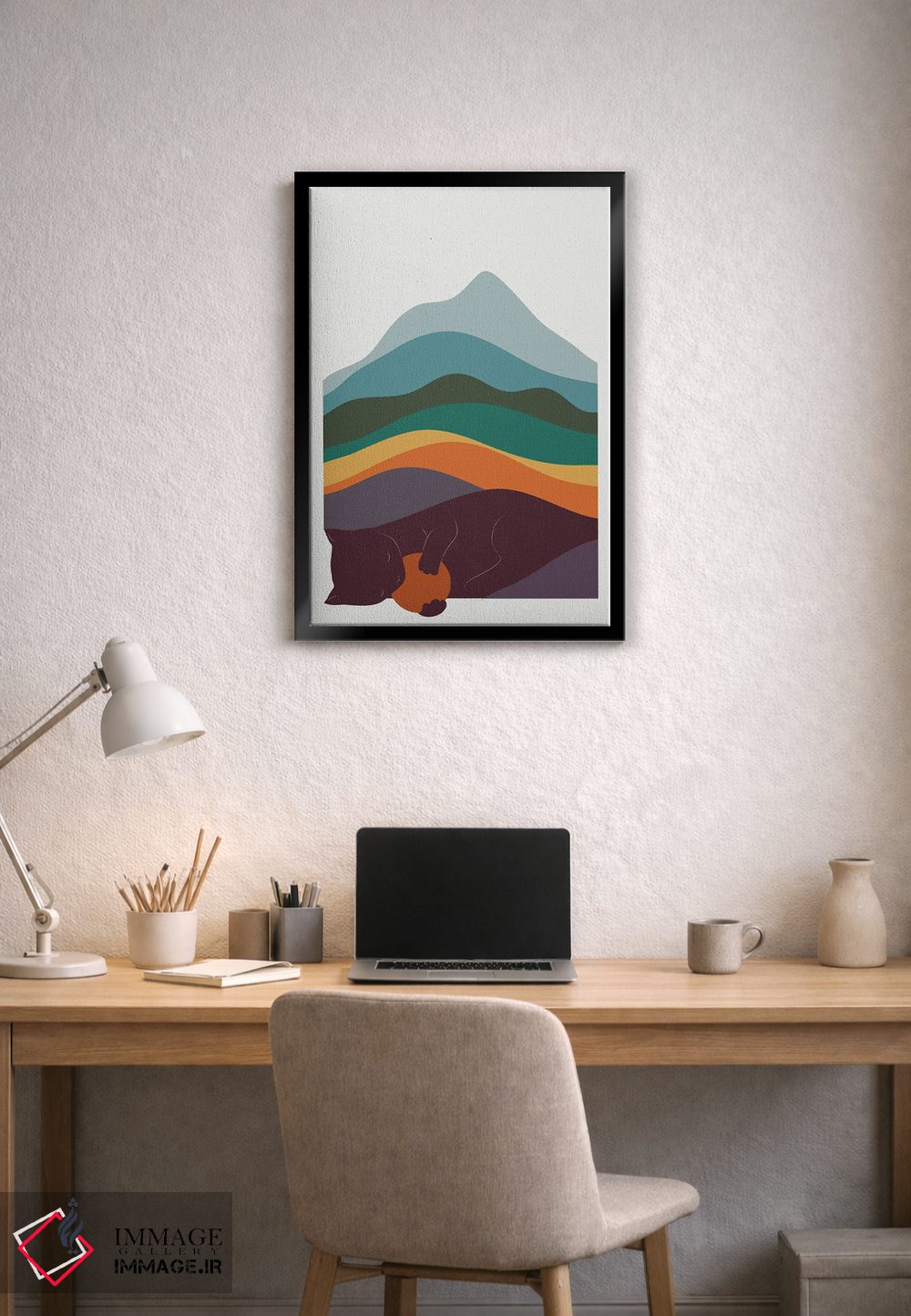 براساس پالت ترکیبی اثر، قاب تیک گرم (چوبی) پیشنهاد اول است و مشکی مات (فریم متوسط) مکمل. برای سفارشهای پروژهای با ابعاد و قابهای اختصاصی با ایماژ در تماس باشید.