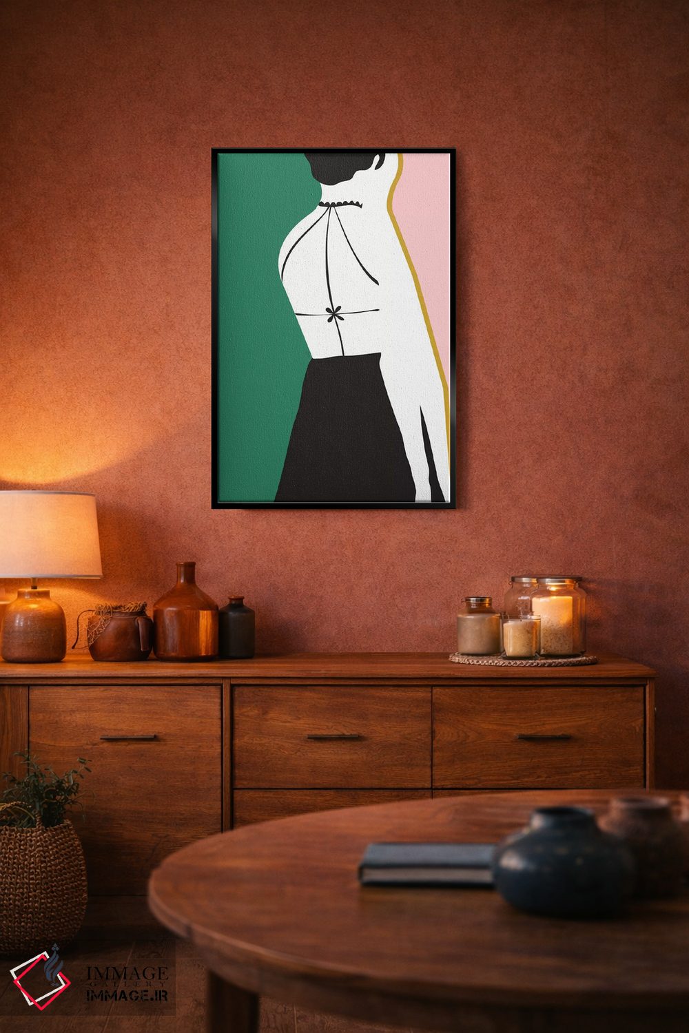 براساس پالت ترکیبی اثر، قاب تیک گرم (چوبی) پیشنهاد اول است و مشکی مات (فریم متوسط) مکمل. برای سفارشهای پروژهای با ابعاد و قابهای اختصاصی با ایماژ در تماس باشید.