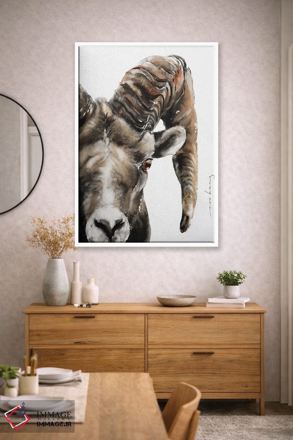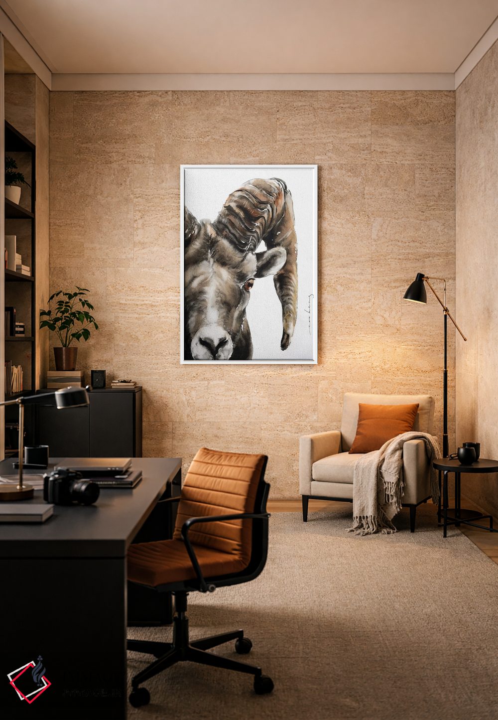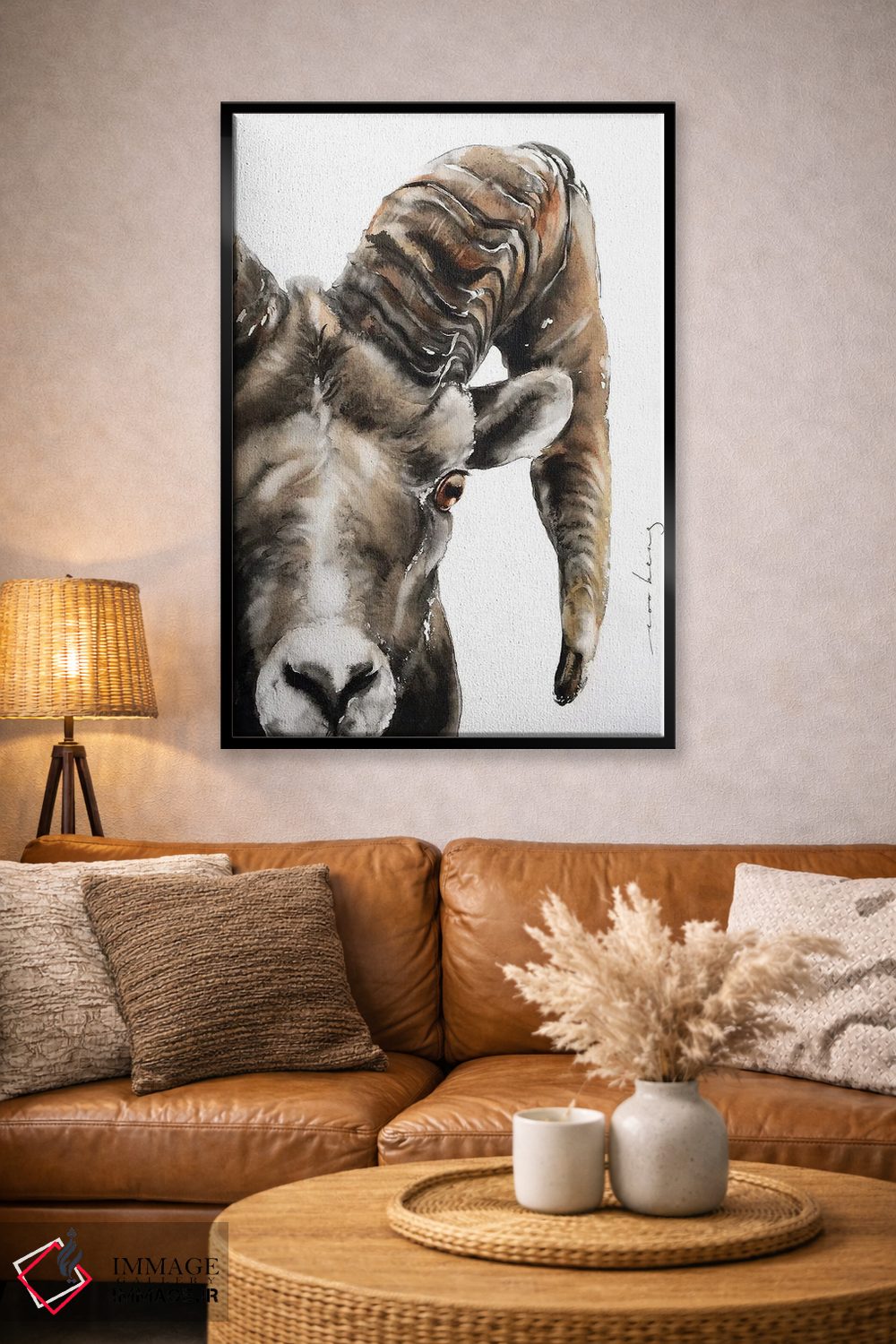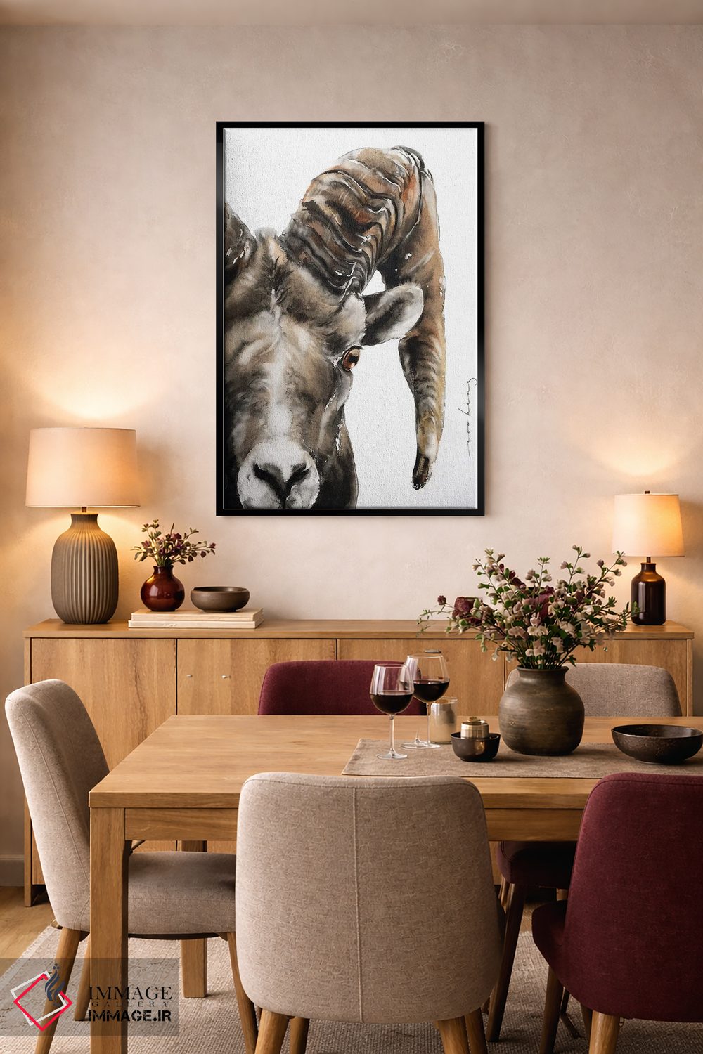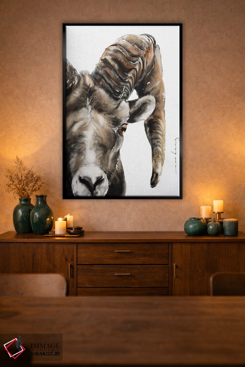 «قوچ سنگی» اثرِ «سو بنگ لیم» از آن کارهاییست که به دیوار، انرژیِ نرم و زنده میدهد؛ برای کافههای کوچک و صمیمی انتخاب خوبیست. با نورپردازی نقطهای، جذابتر هم میشود.