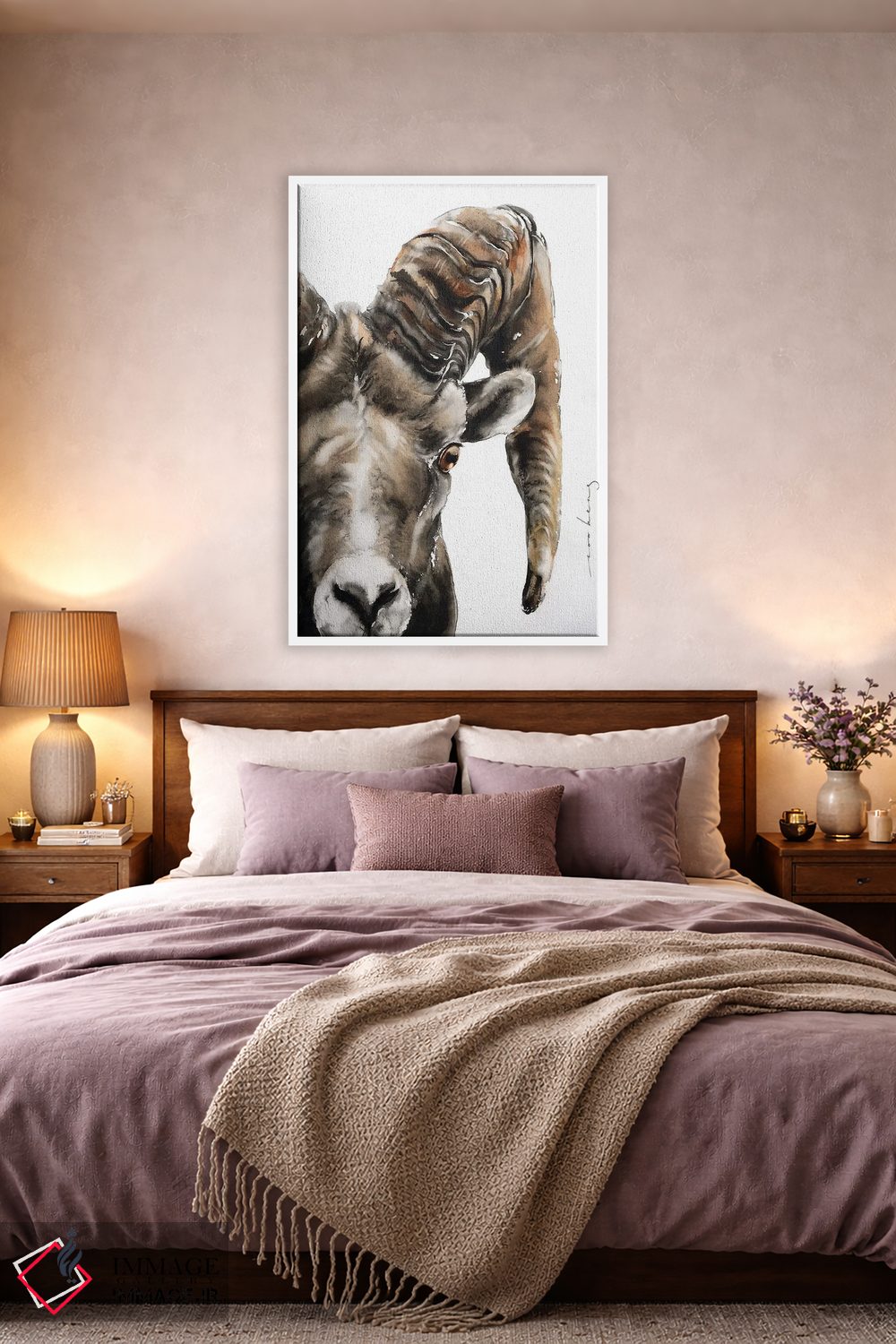 براساس پالت گرم اثر، قاب بلوط روشن (چوبی) پیشنهاد اول است و استخوانی ملایم مکمل. برای سفارشهای پروژهای با ابعاد و قابهای اختصاصی با ایماژ در تماس باشید.