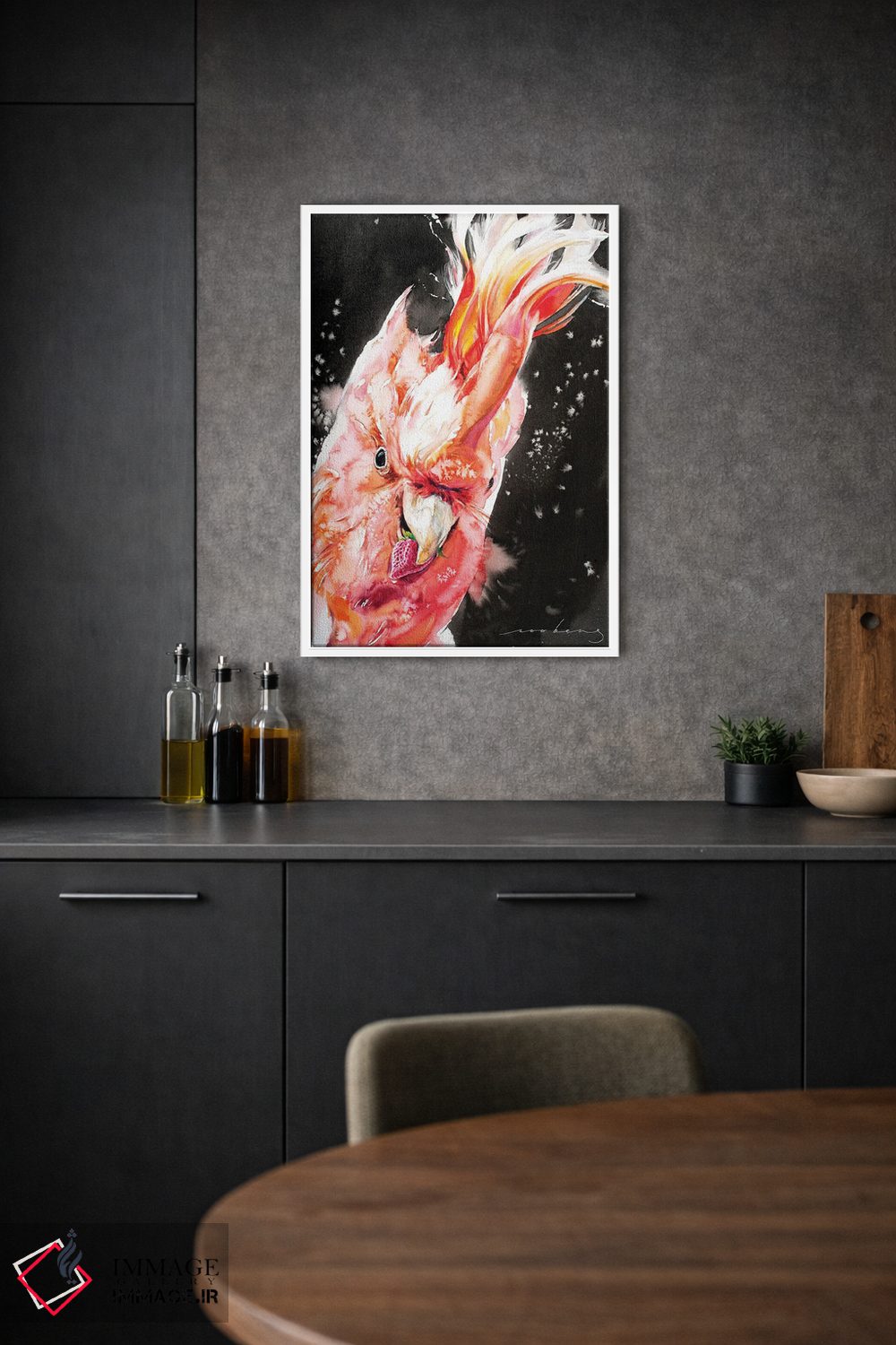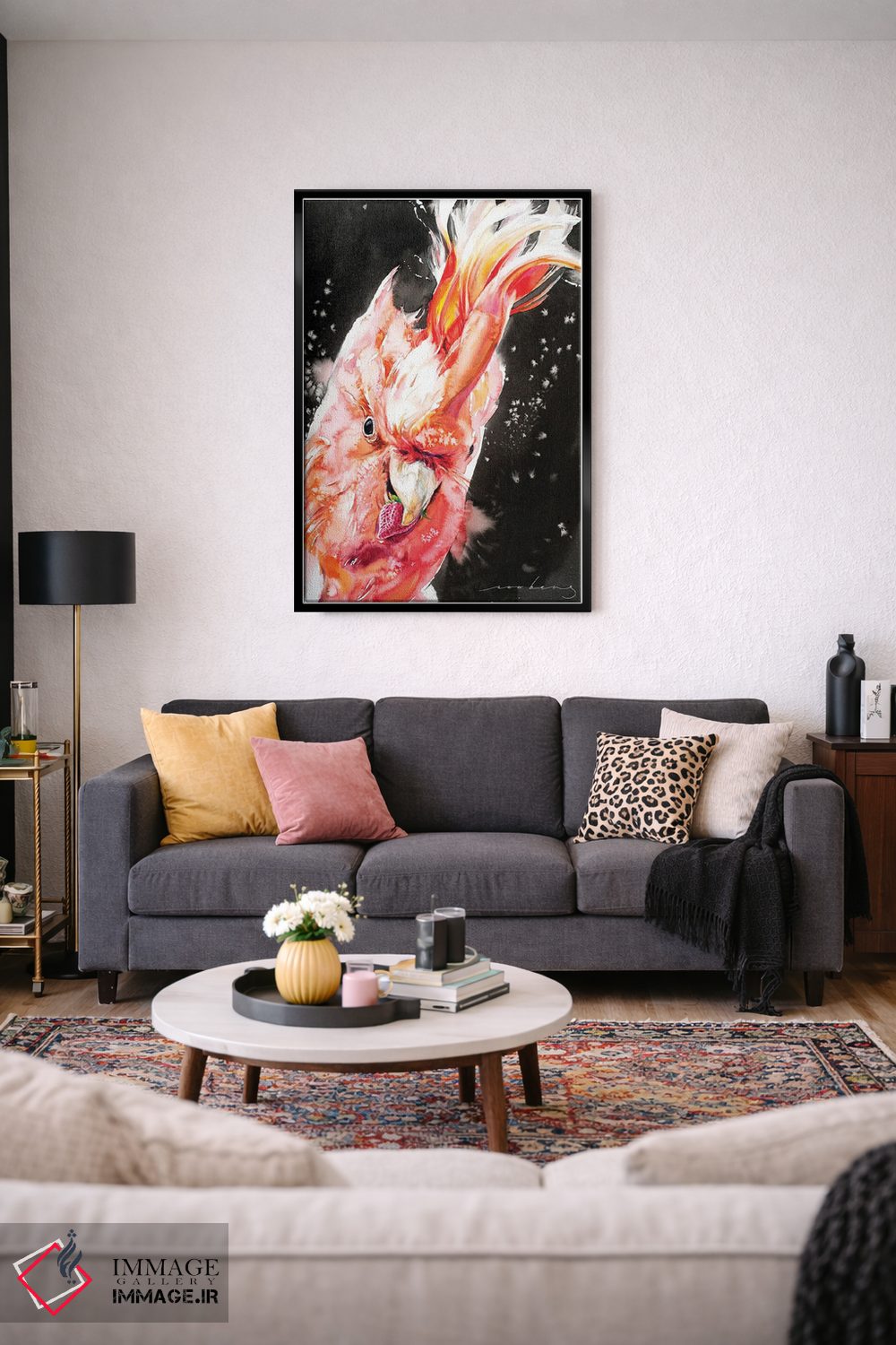 این تابلو با عنوان «کاکاتوآ II (طوطی کاکلسفید)» اثرِ «سو بنگ لیم»، حسِ گرم و صمیمی به فضا میدهد.