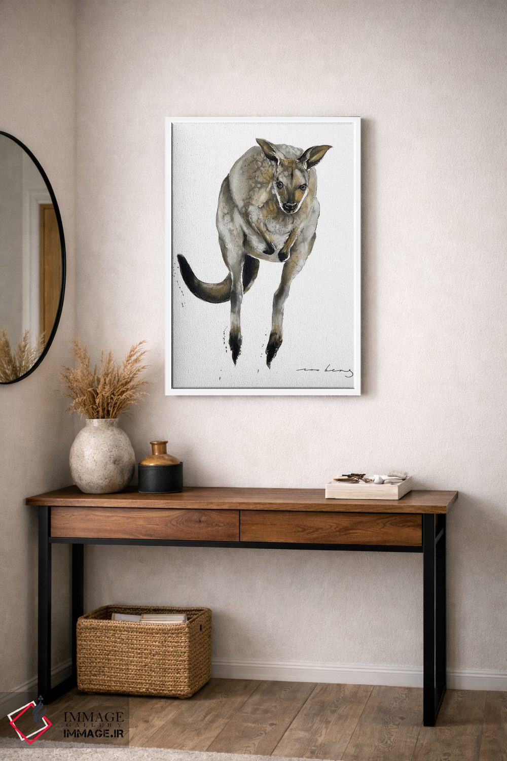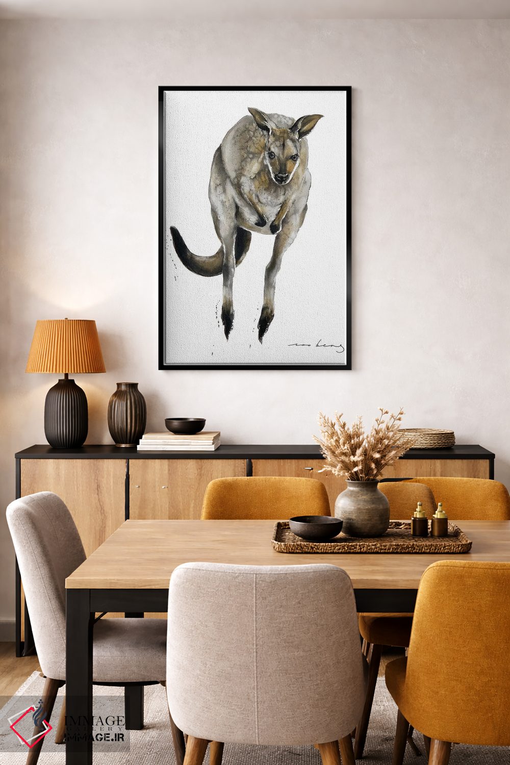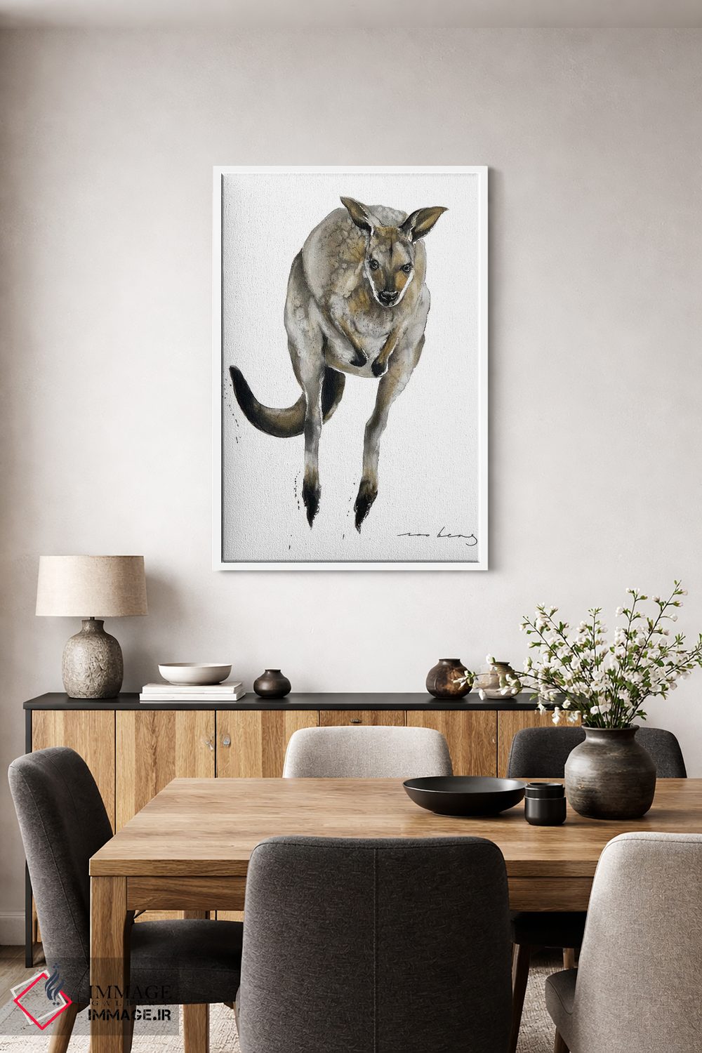 برای دیوارهای ساده، «کانگورو استرالیایی» اثرِ «سو بنگ لیم» در کنار رنگهای خنثی، تضاد دلچسبی میسازد؛ برای دیوار کنار میز کار انتخابی خوشسلیقه است. به دیوار، قصه میدهد—اما قصهای آرام و شیک.