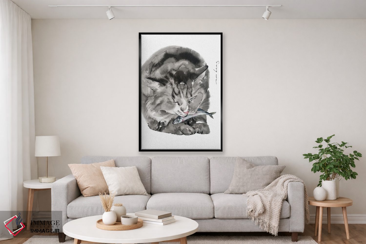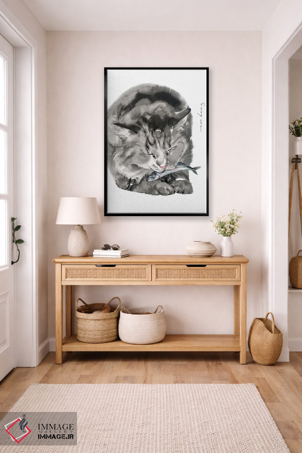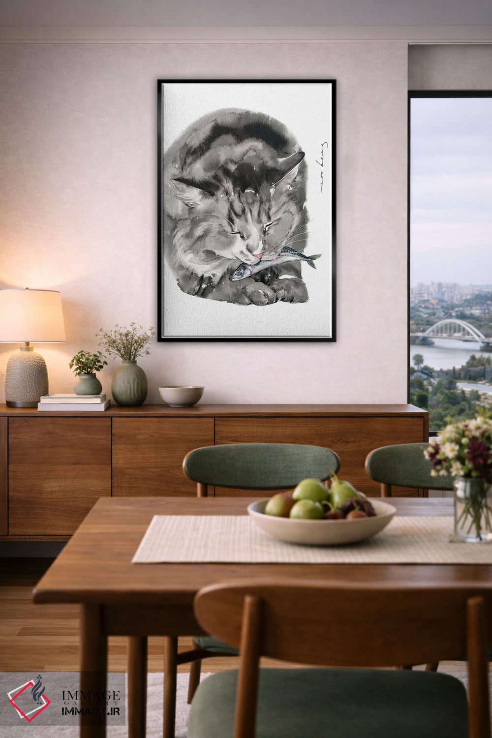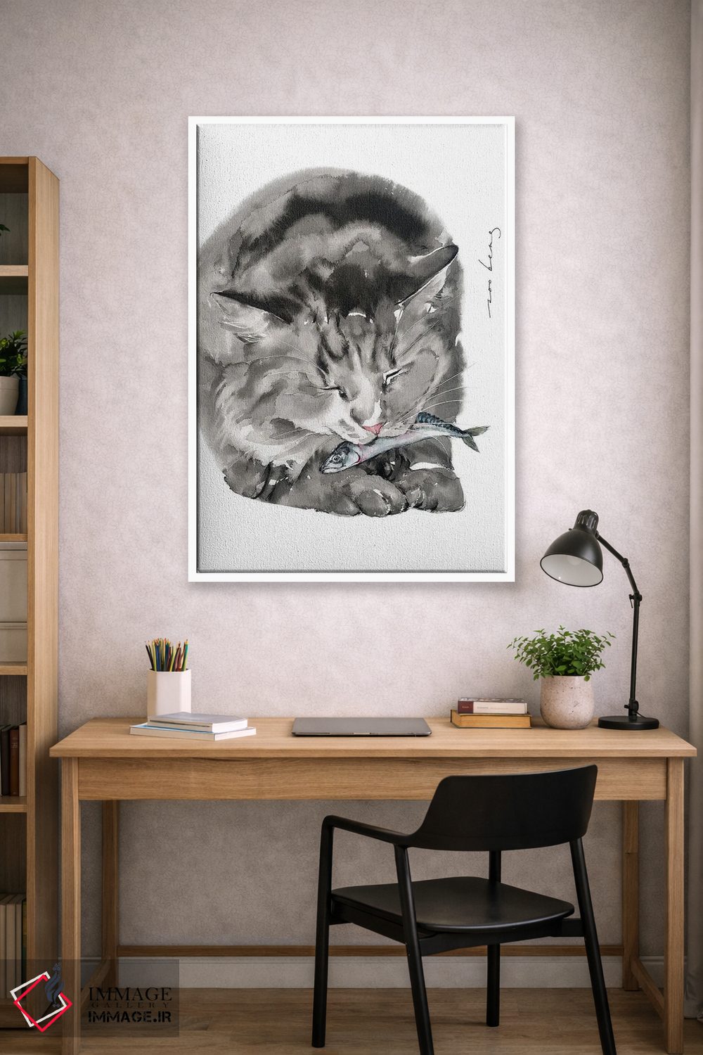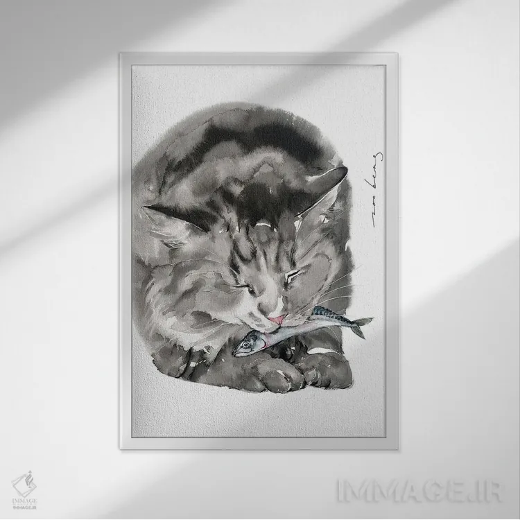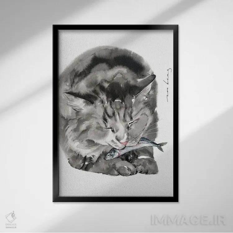 اگر میخواهید دیوار کمی سرزندگیِ محترمانه داشته باشد، «غذای گربه» اثرِ «سو بنگ لیم» گرما و شخصیت به فضا اضافه میکند، برای دیوار کنار میز کار گزینهٔ مناسبیست. با قاب چوبی یا مشکی، حس مرتبتری پیدا میکند.