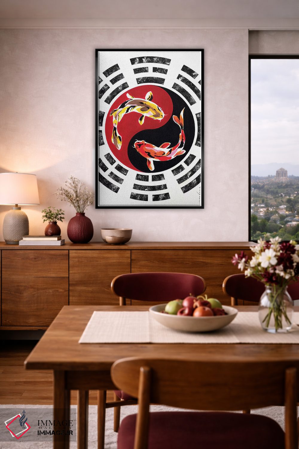 برای دیواری که میخواهید سلیقهتان را آرام و دقیق نشان بدهد، «ماهی کوی (نوعی ماهی زینتی ژاپنی)» اثرِ «سو بنگ لیم» ریتم فضا را منظم میکند؛ برای فضاهایی با نور طبیعی پیشنهاد میشود. در کنار قاب مناسب، جلوهٔ کار چند برابر میشود.