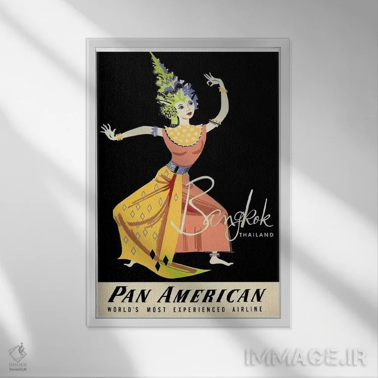 «Thailand، بانکوک، تایلند» اثرِ «هنرمند ناشناس» با تایپوگرافیِ کنترلشده، روی دیوار خوب مینشیند؛ برای کنار کتابخانه، میز کار یا راهروهای باریک عالی است.