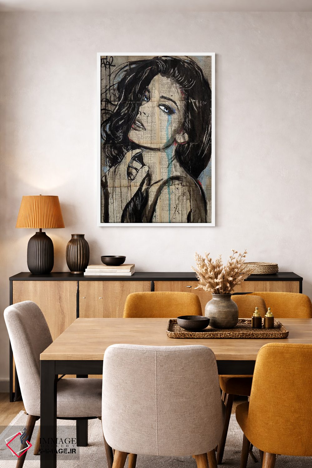 براساس پالت گرم اثر، قاب بلوط روشن (چوبی) پیشنهاد اول است و استخوانی ملایم مکمل. برای سفارشهای پروژهای با ابعاد و قابهای اختصاصی با ایماژ در تماس باشید.