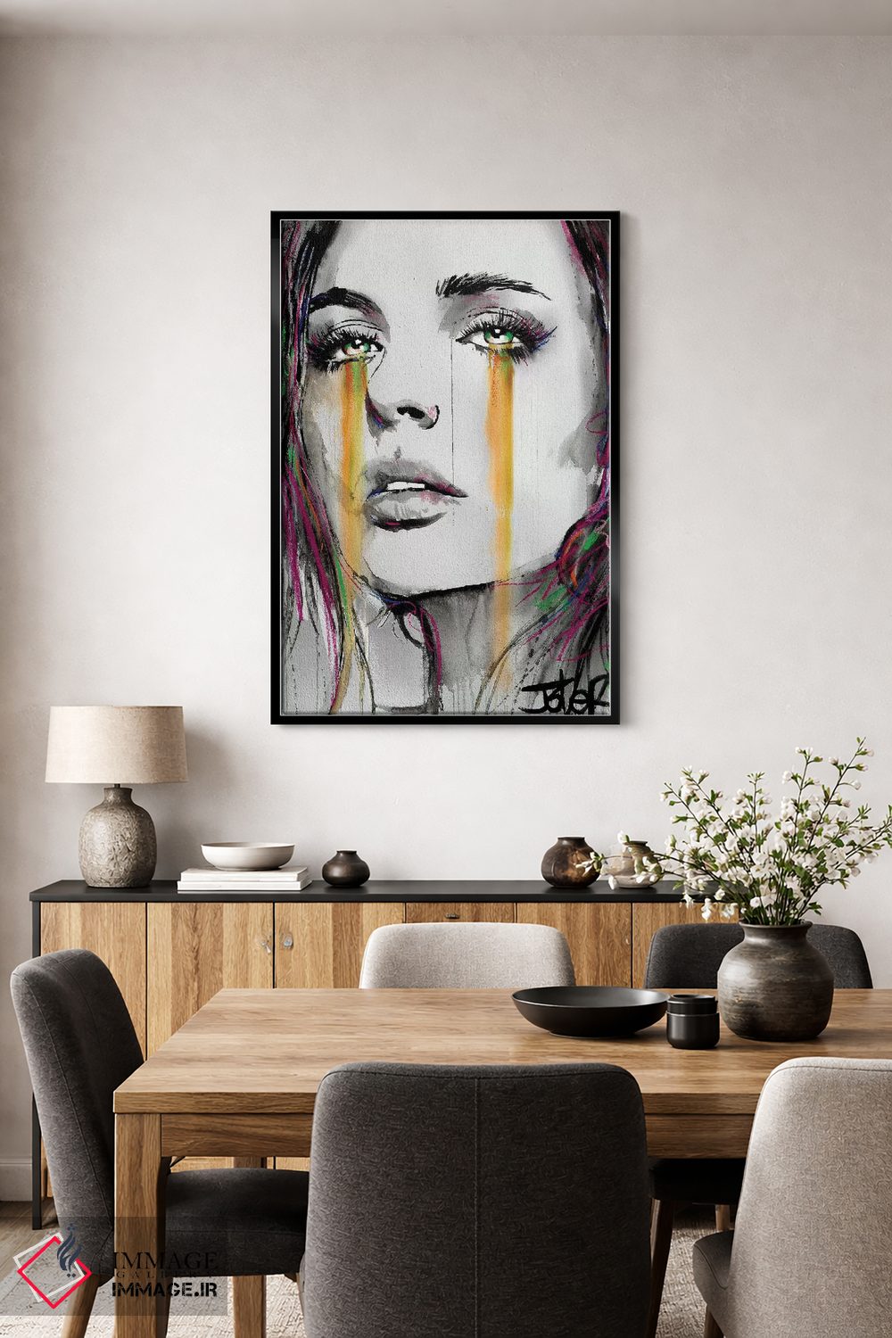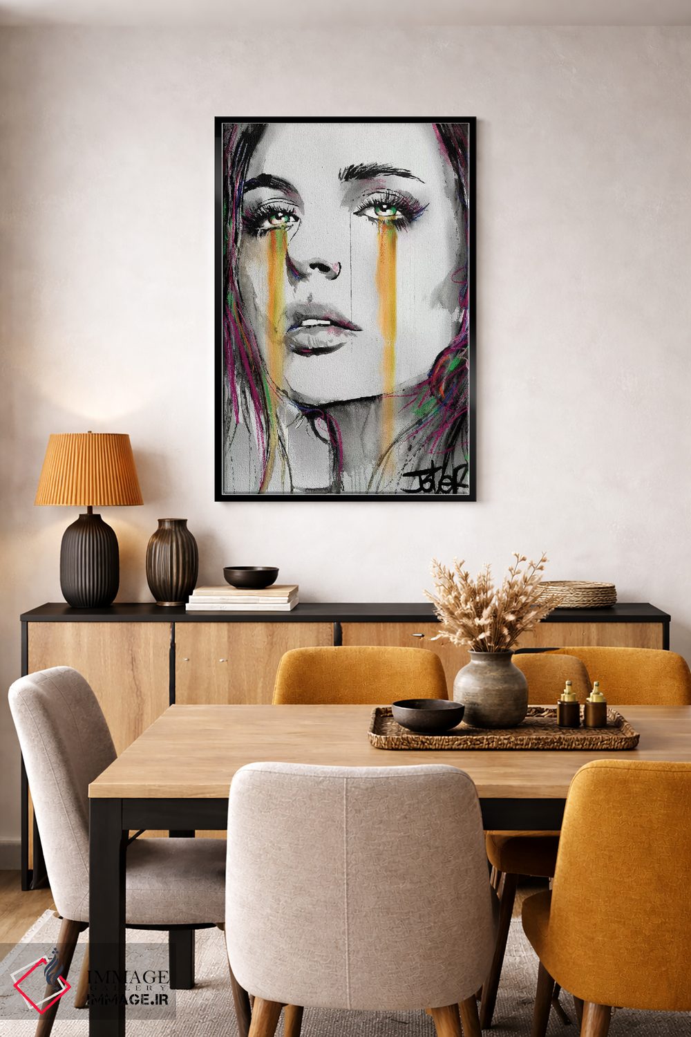 براساس پالت گرم اثر، قاب تیک گرم (چوبی) پیشنهاد اول است و مشکی مات (فریم متوسط) مکمل. برای سفارشهای پروژهای با ابعاد و قابهای اختصاصی با ایماژ در تماس باشید.