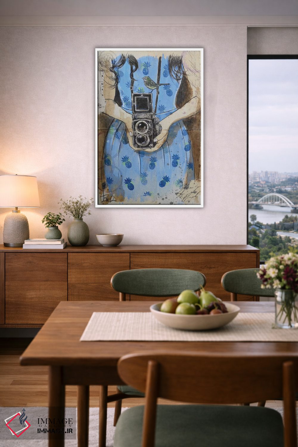 طراحی بوم گالری ایماژ بهگونهای است که اثر روی دیوار «پرداختشده» و حرفهای دیده شود—نه پرزرقوبرقِ بیپایه؛ بلکه دقیق و خوشپرداخت. بافت ظریف کنواس کمک میکند حس اثر هنری را در نگاه نزدیک نگه میدارد و همین «پرداخت» تفاوت را میسازد. با کنترل تونها، تعادل بهتری بین نور و رنگ ایجاد میکند بهخصوص وقتی نور موضعی ملایم داشته باشید. حاصل کار، یک تابلو خوشنشین است که هم از دور اثرگذار است و هم از نزدیک خوشخوان؛ و اگر بخواهید، میتوان چیدمان را برای گالریوال هم پیشنهاد داد.