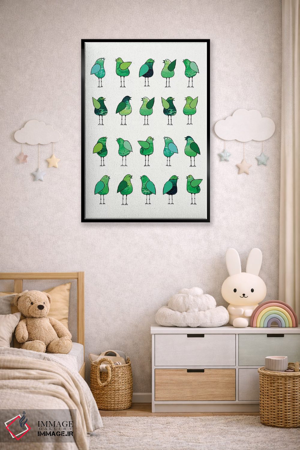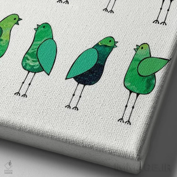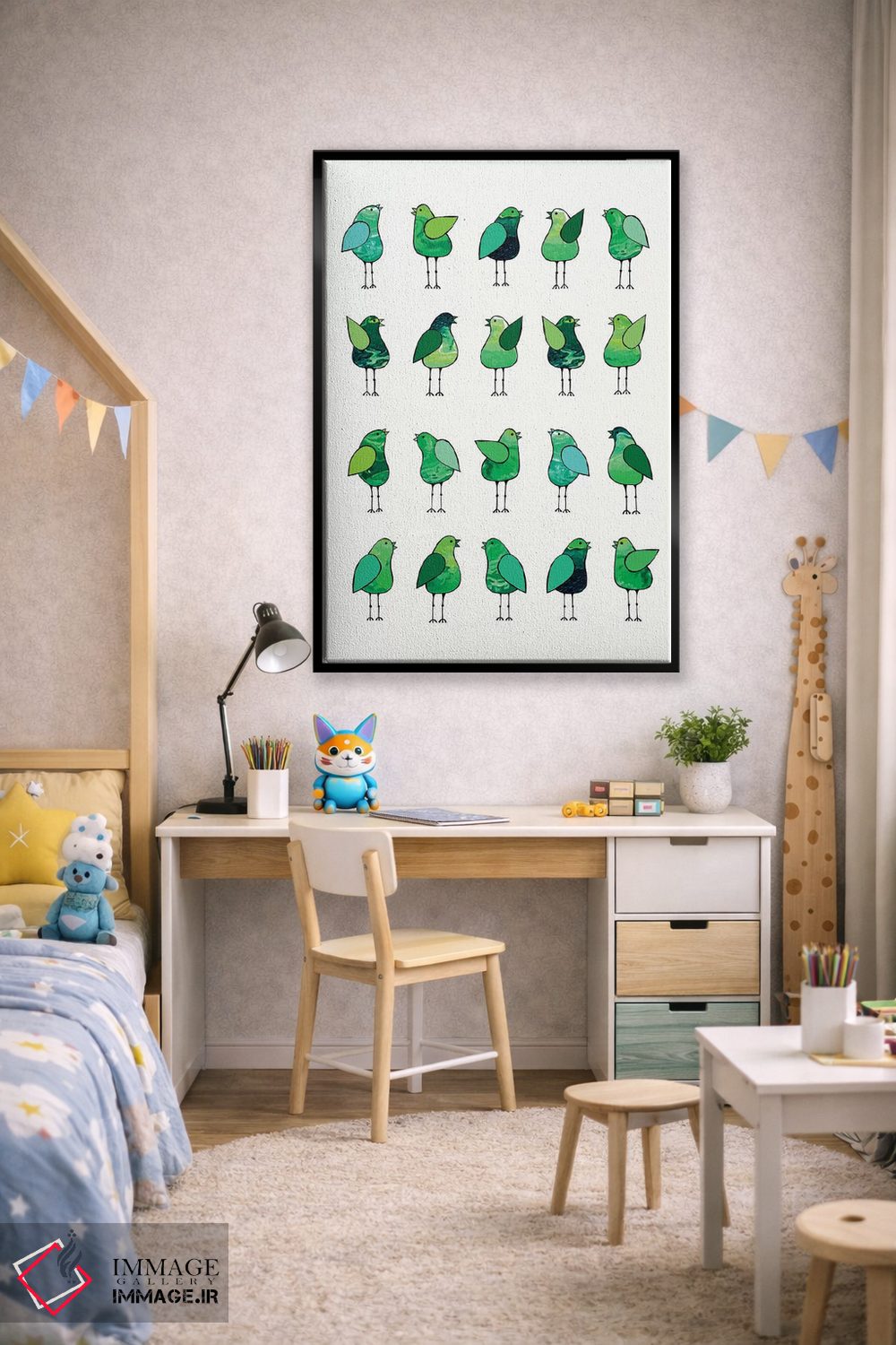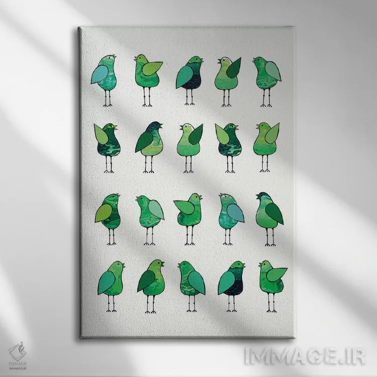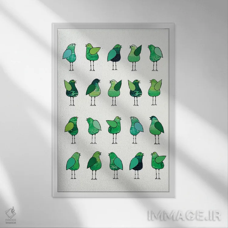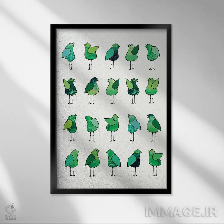 برای دیوارهای ساده، «پرندگان خبرچین سبز» اثرِ «لیزا فرانسیس جاد» برای دکورهای مینیمال، یک نقطهٔ توجه میسازد؛ برای راهروها و ورودیهای گرم انتخابی خوشسلیقه است. به دیوار، قصه میدهد—اما قصهای آرام و شیک.