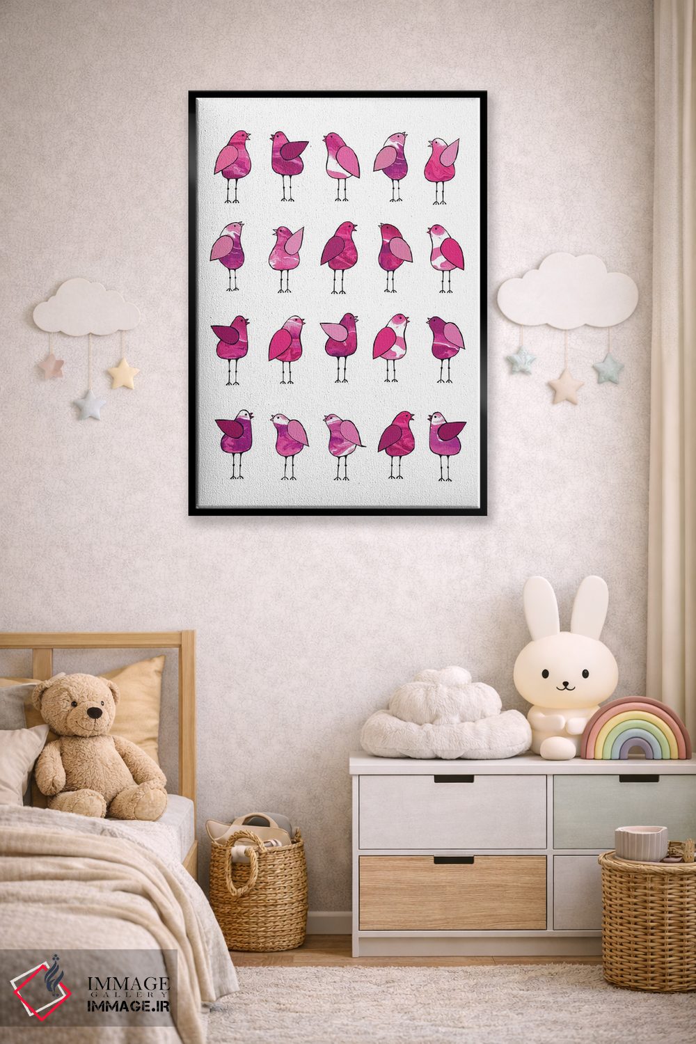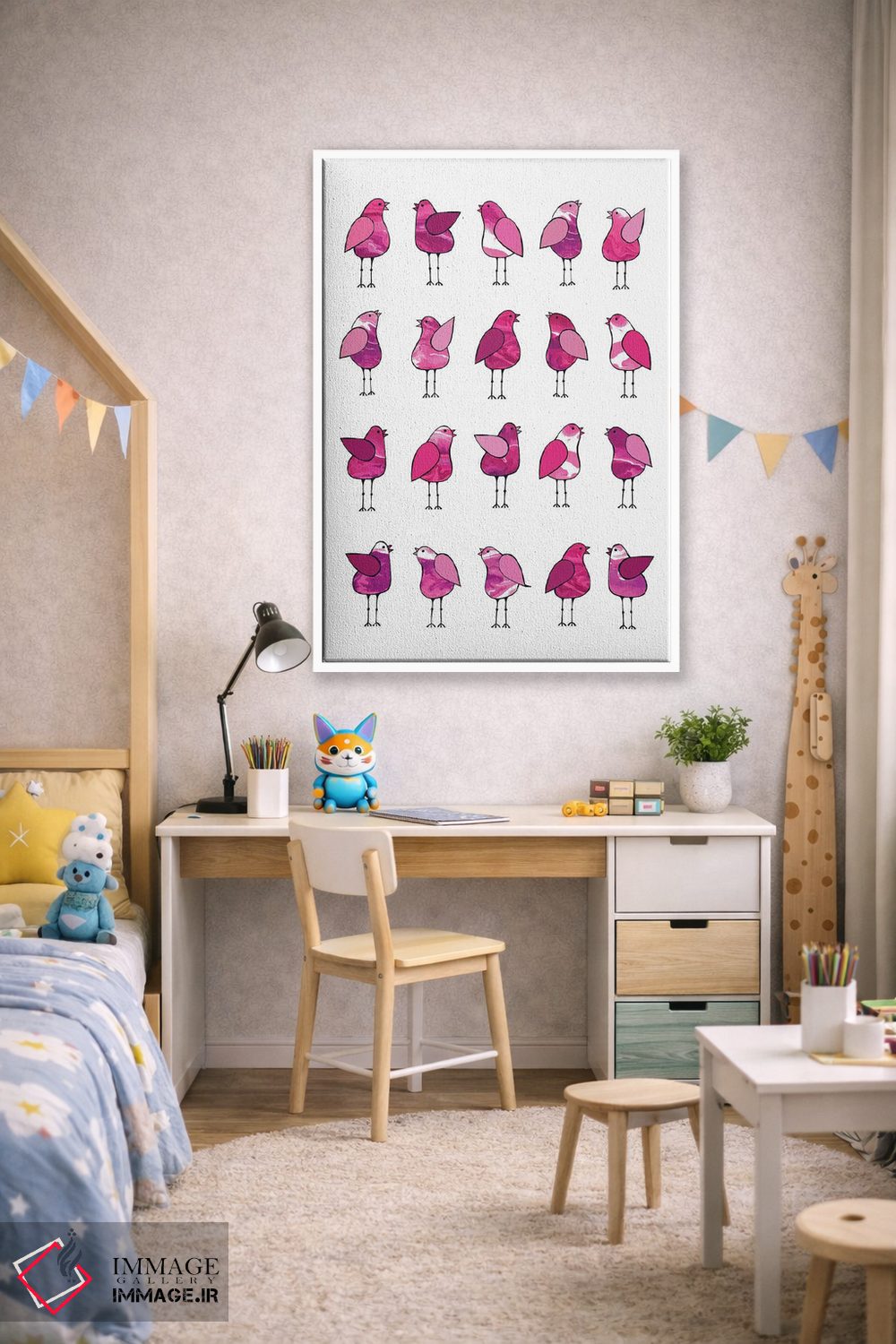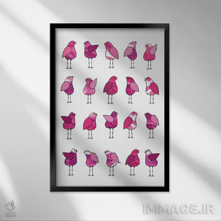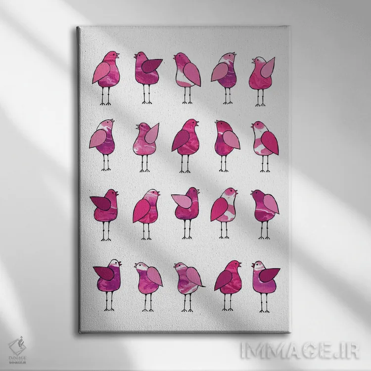 «پرندگان خبرچین صورتی» اثرِ «لیزا فرانسیس جاد» از آن کارهاییست که به دیوار، انرژیِ نرم و زنده میدهد؛ برای اتاق کودک (بدون لحن کودکانه) انتخاب خوبیست. به دیوار، قصه میدهد—اما قصهای آرام و شیک.