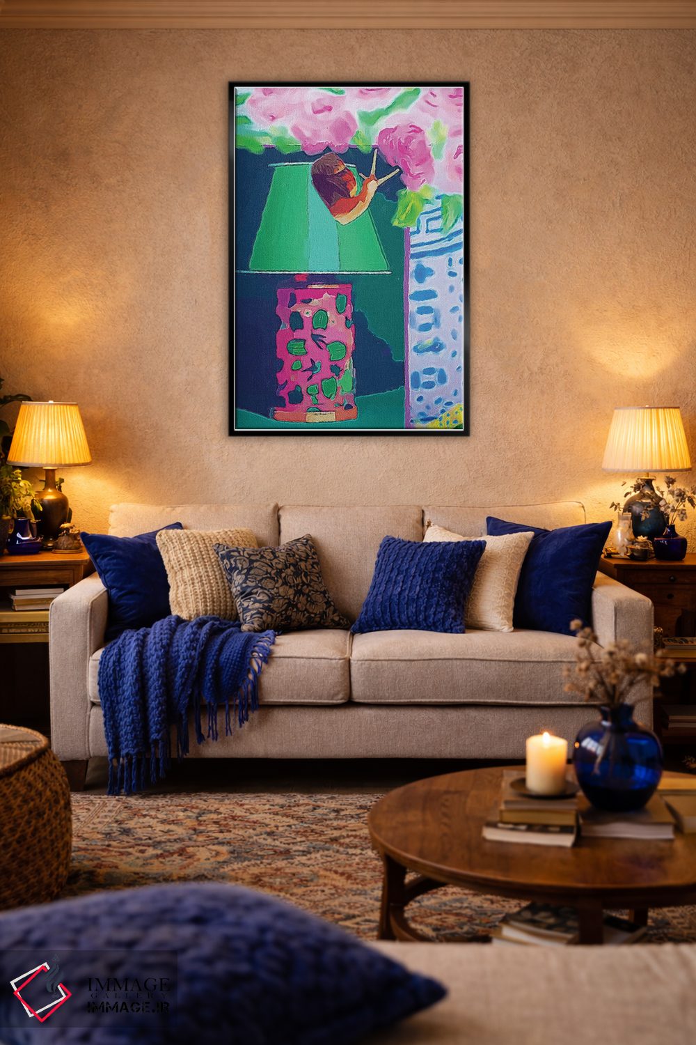 اگر به آثار حیوانات علاقه دارید، «حلزون روی زمینه صورتی و سبز» اثرِ «لوسی کلیمنکو» بافت و جزئیات را طوری نشان میدهد که نگاه میماند، برای کافههای کوچک و صمیمی گزینهٔ مناسبیست. حسش صمیمی است، اما کیفیتش جدی و خوشپرداخت.