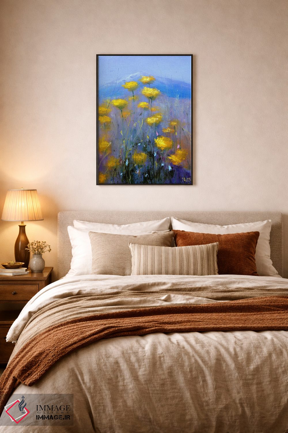 براساس پالت ترکیبی اثر، قاب تیک گرم (چوبی) پیشنهاد اول است و مشکی مات (فریم متوسط) مکمل. برای سفارشهای پروژهای با ابعاد و قابهای اختصاصی با ایماژ در تماس باشید.
