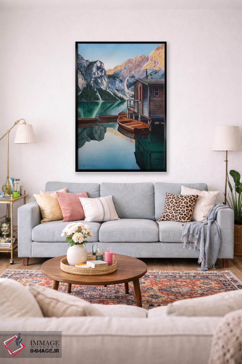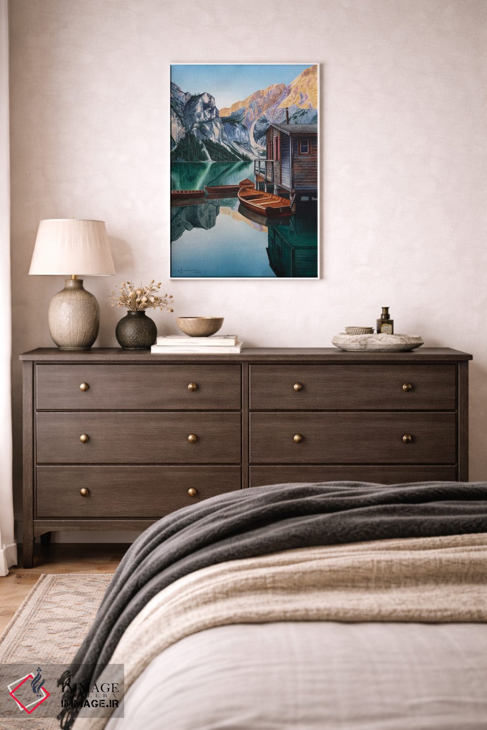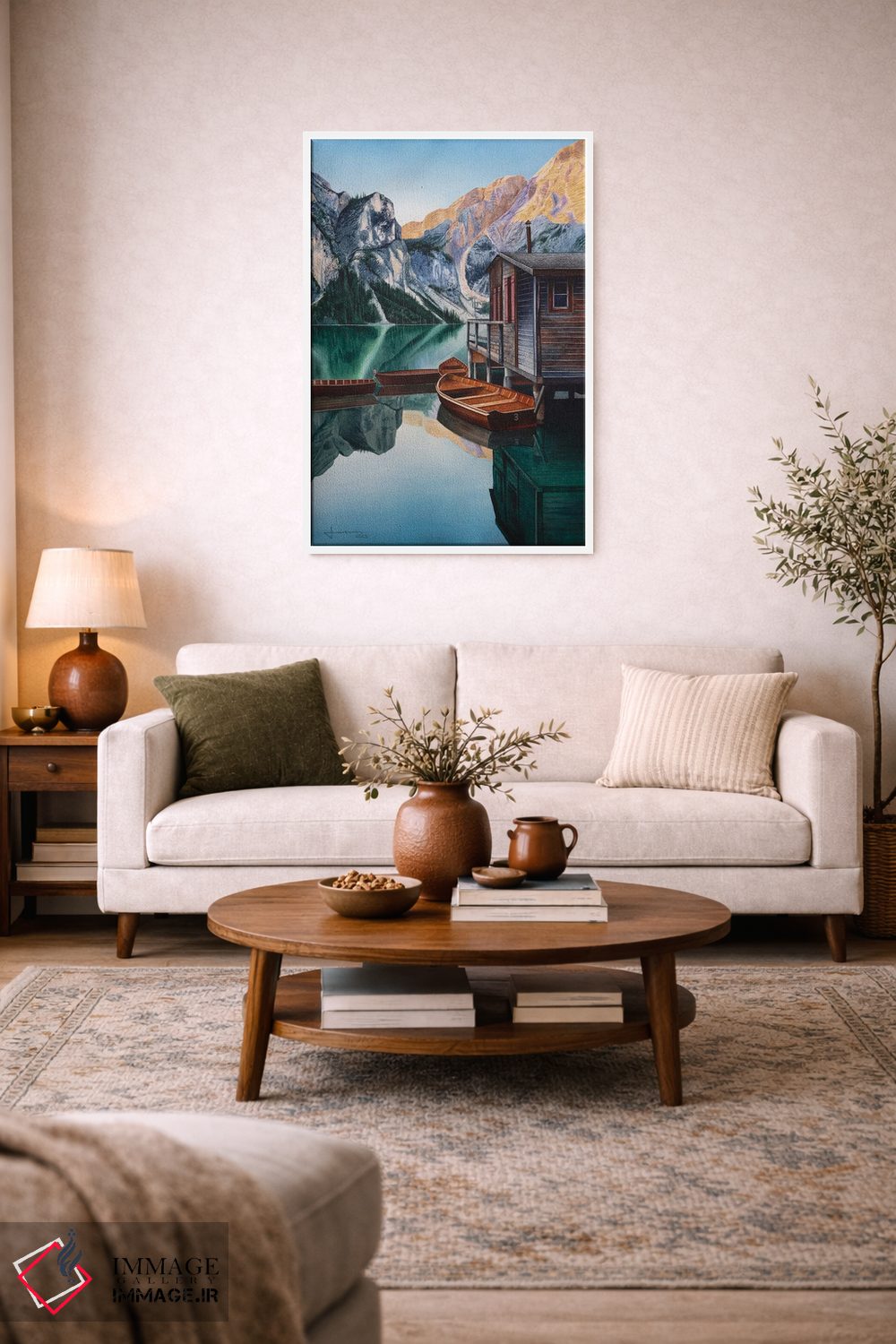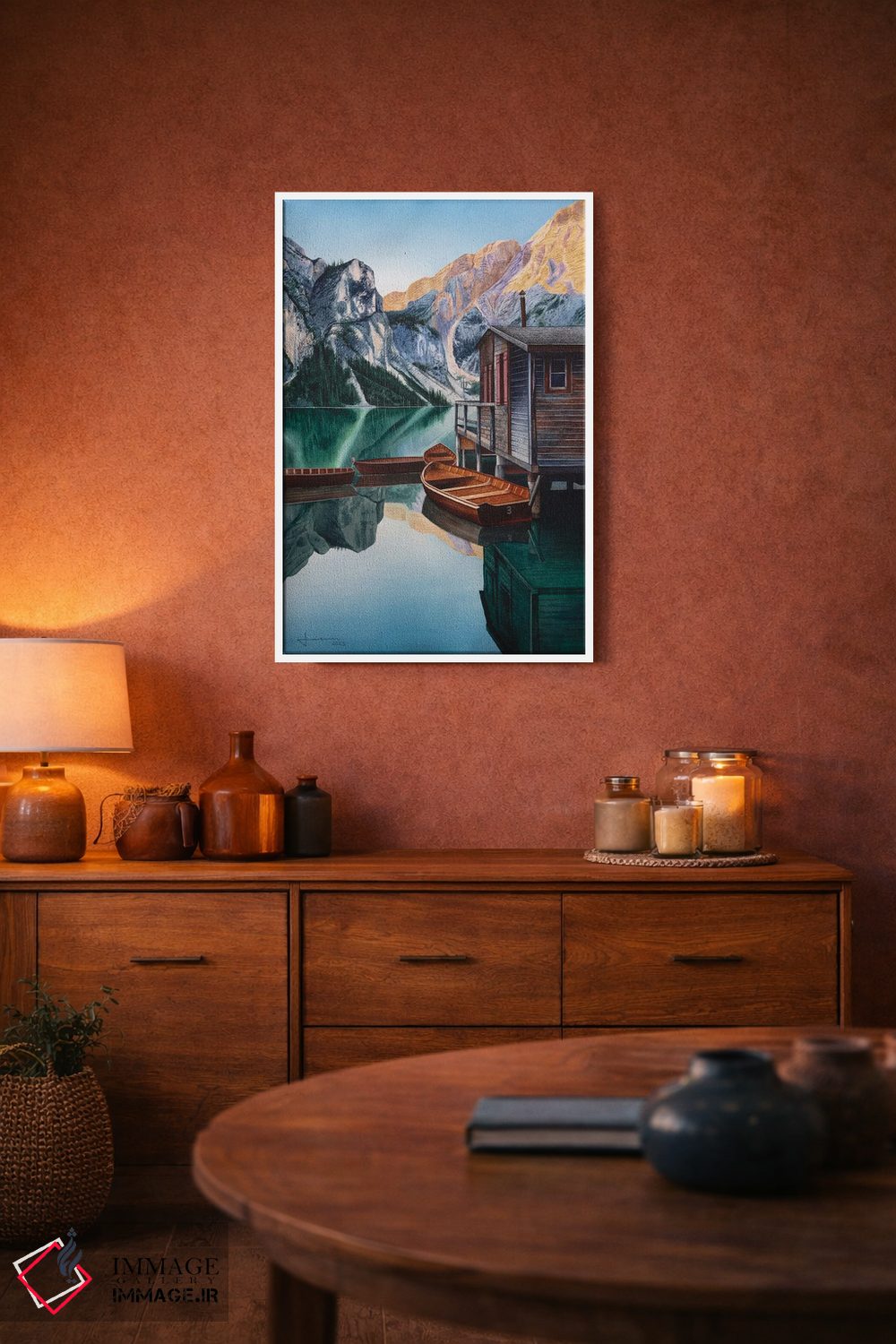 «دریاچه آرام» اثرِ «لیام کوموات» میتواند اتاق را مرتبتر و منسجمتر نشان دهد؛ برای اتاق جلسات پیشنهاد شود. فضا را شلوغ نکند؛ فقط ساختار میدهد.