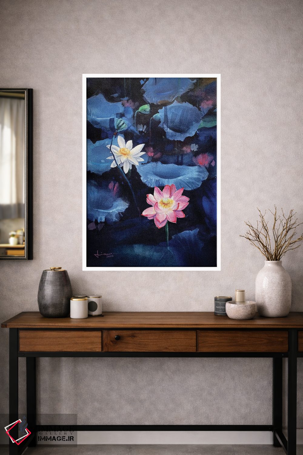 براساس پالت ترکیبی اثر، قاب تیک گرم (چوبی) پیشنهاد اول است و مشکی مات (فریم متوسط) مکمل. برای سفارشهای پروژهای با ابعاد و قابهای اختصاصی با ایماژ در تماس باشید.