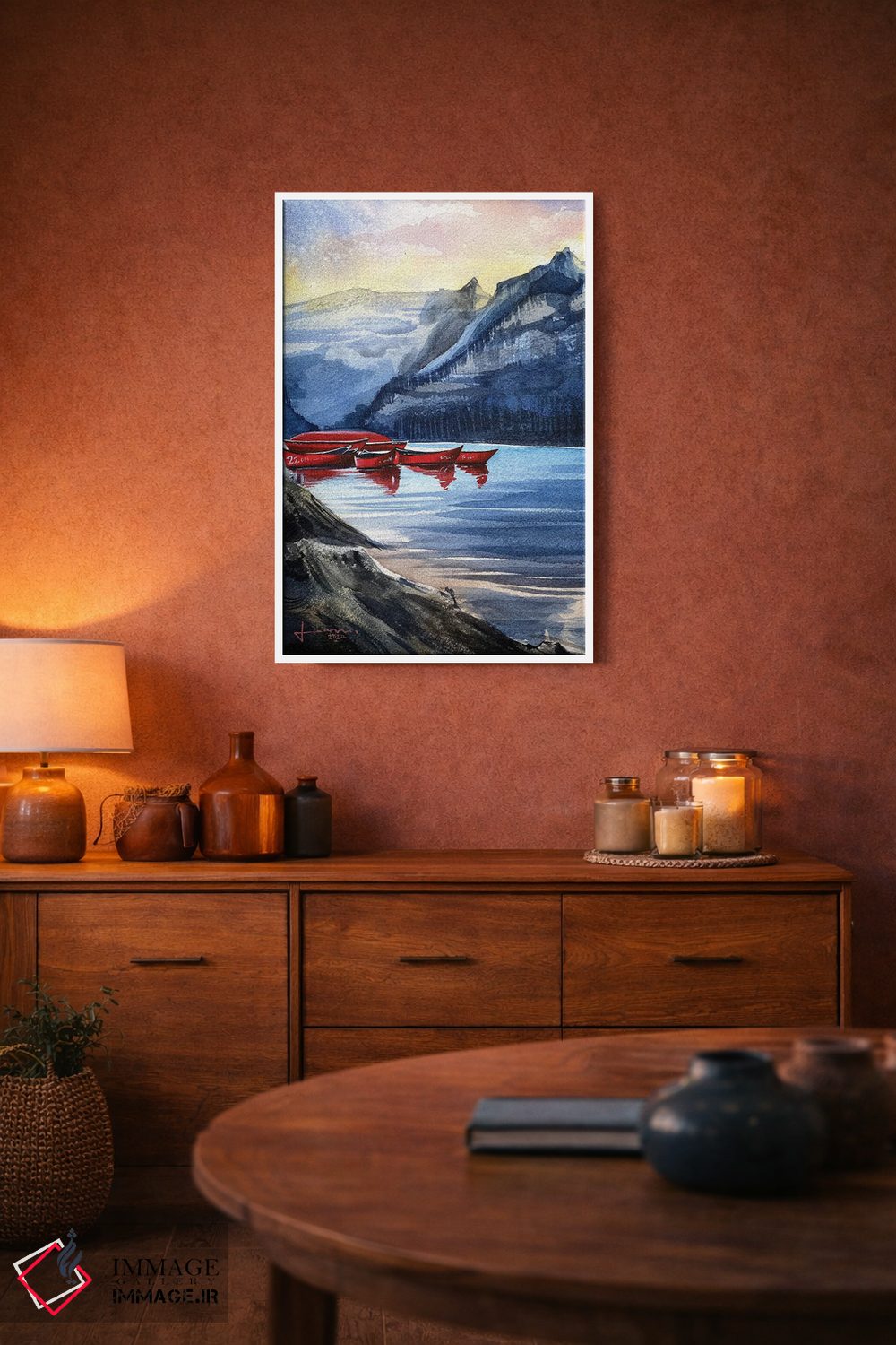براساس پالت ترکیبی اثر، قاب تیک گرم (چوبی) پیشنهاد اول است و مشکی مات (فریم متوسط) مکمل. برای سفارشهای پروژهای با ابعاد و قابهای اختصاصی با ایماژ در تماس باشید.