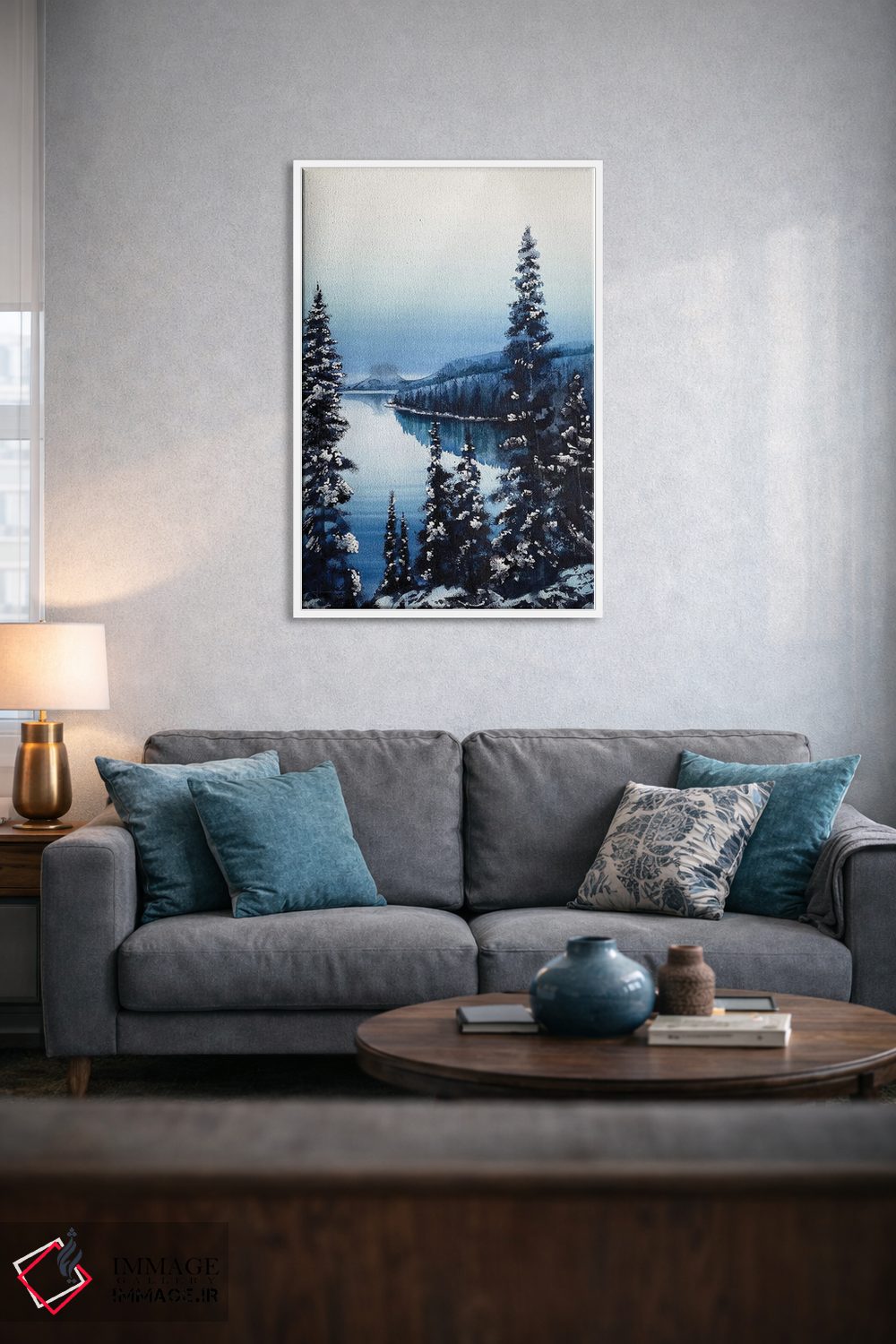 براساس پالت سرد اثر، قاب سفید مات (فریم باریک) پیشنهاد اول است و نقرهای برسخورده (متالیک) مکمل.