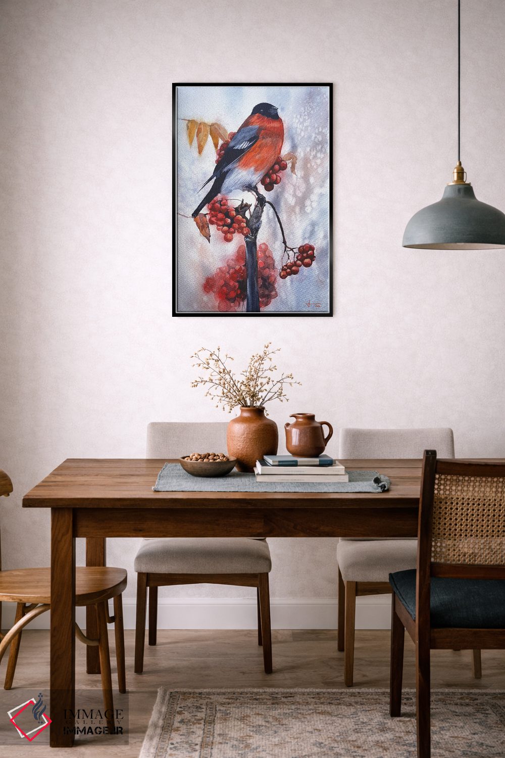 اگر به آثار حیوانات علاقه دارید، «سینهسرخ (پرنده)» اثرِ «لیام کوموات» فضا را صمیمیتر و دعوتکنندهتر نشان میدهد، برای راهروها و ورودیهای گرم گزینهٔ مناسبیست. به دیوار، قصه میدهد—اما قصهای آرام و شیک.