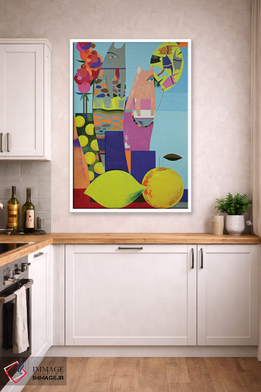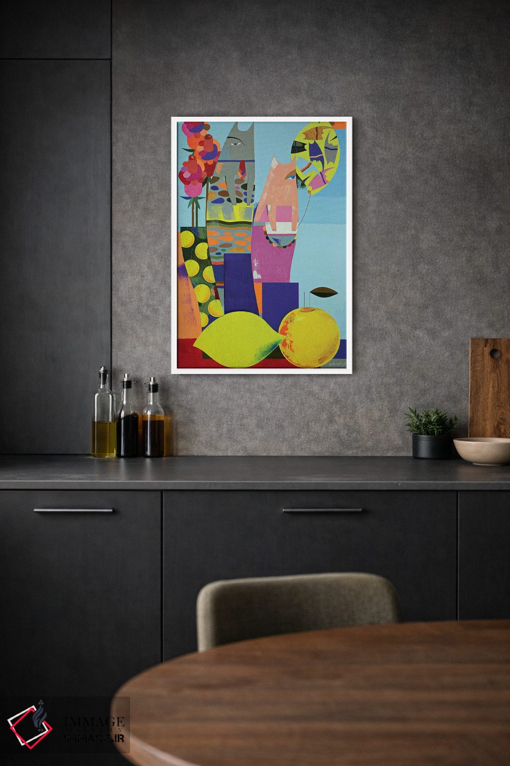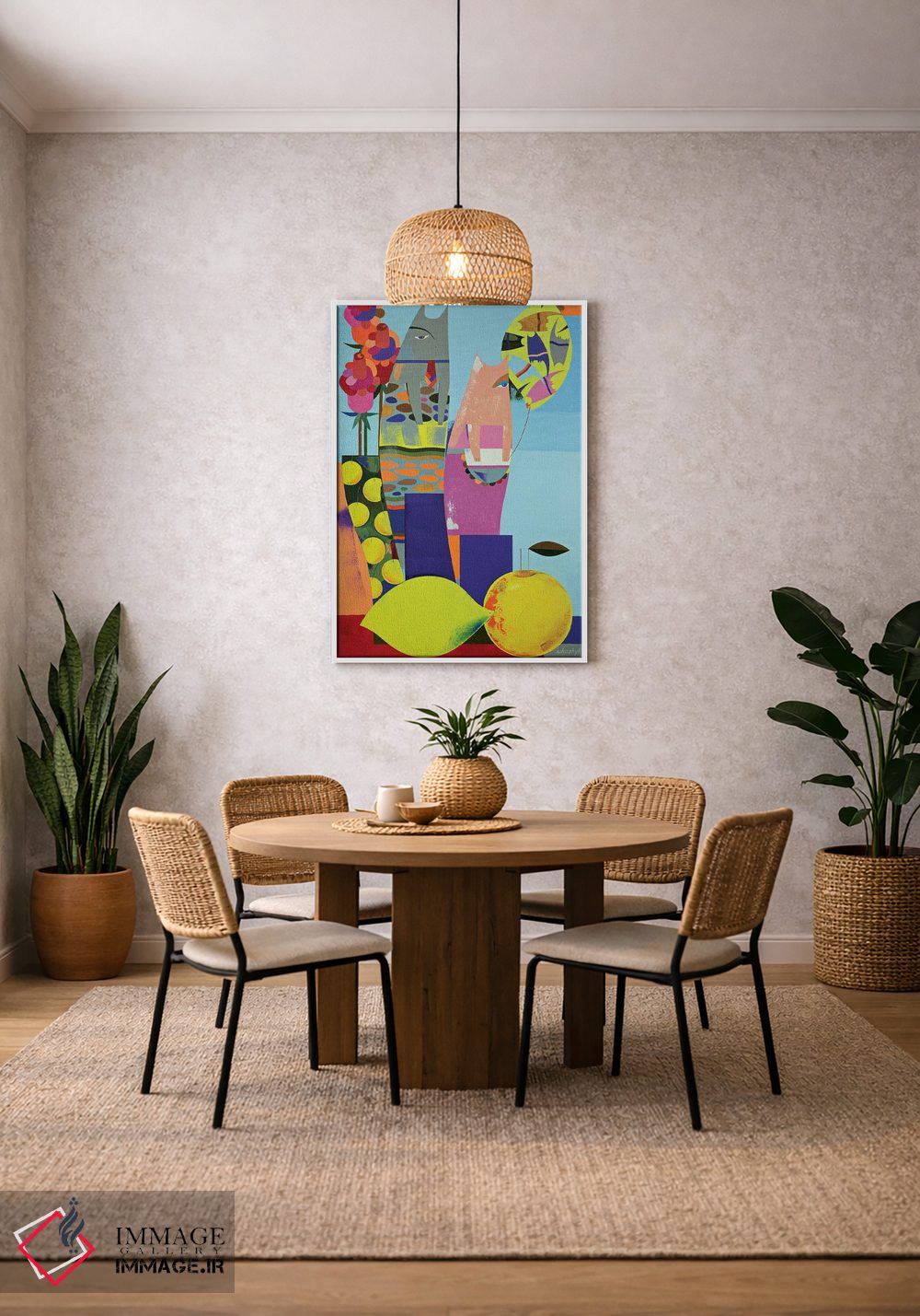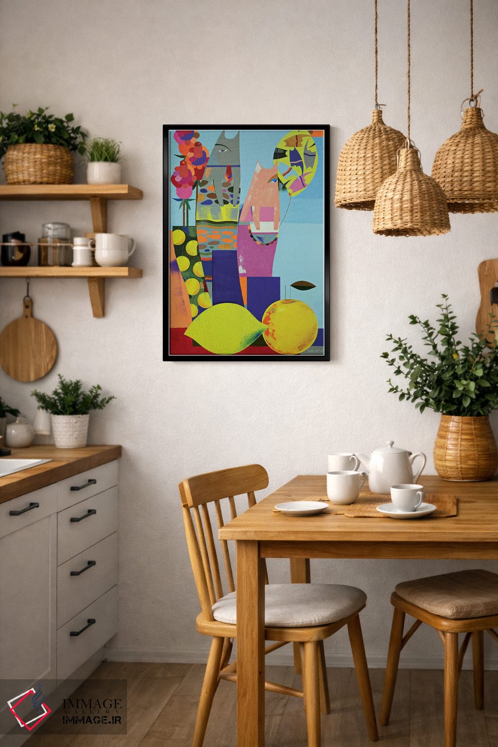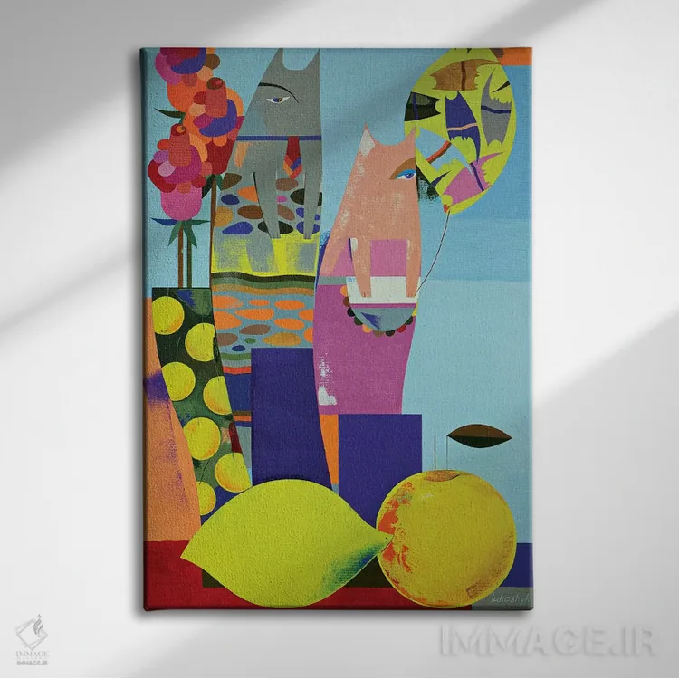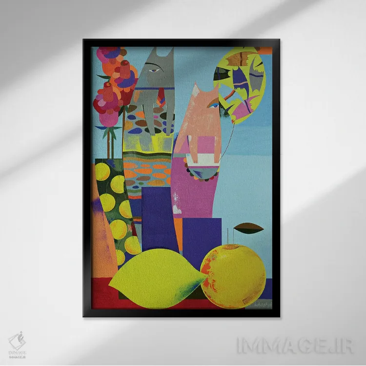براساس پالت ترکیبی اثر، قاب تیک گرم (چوبی) پیشنهاد اول است و مشکی مات (فریم متوسط) مکمل. برای سفارشهای پروژهای با ابعاد و قابهای اختصاصی با ایماژ در تماس باشید.