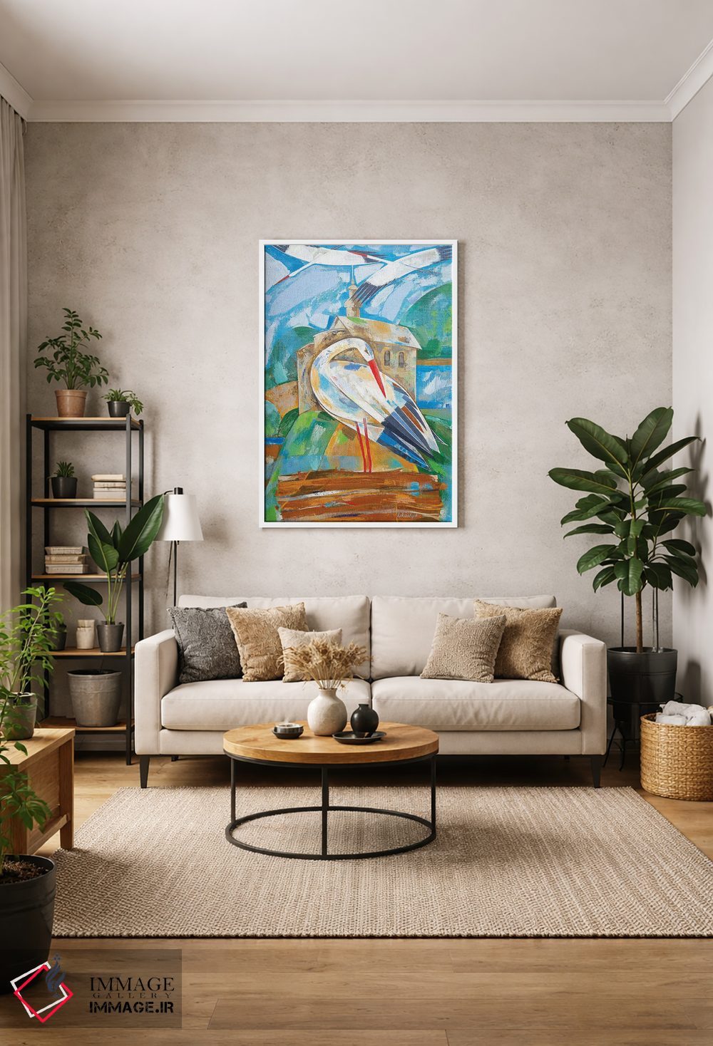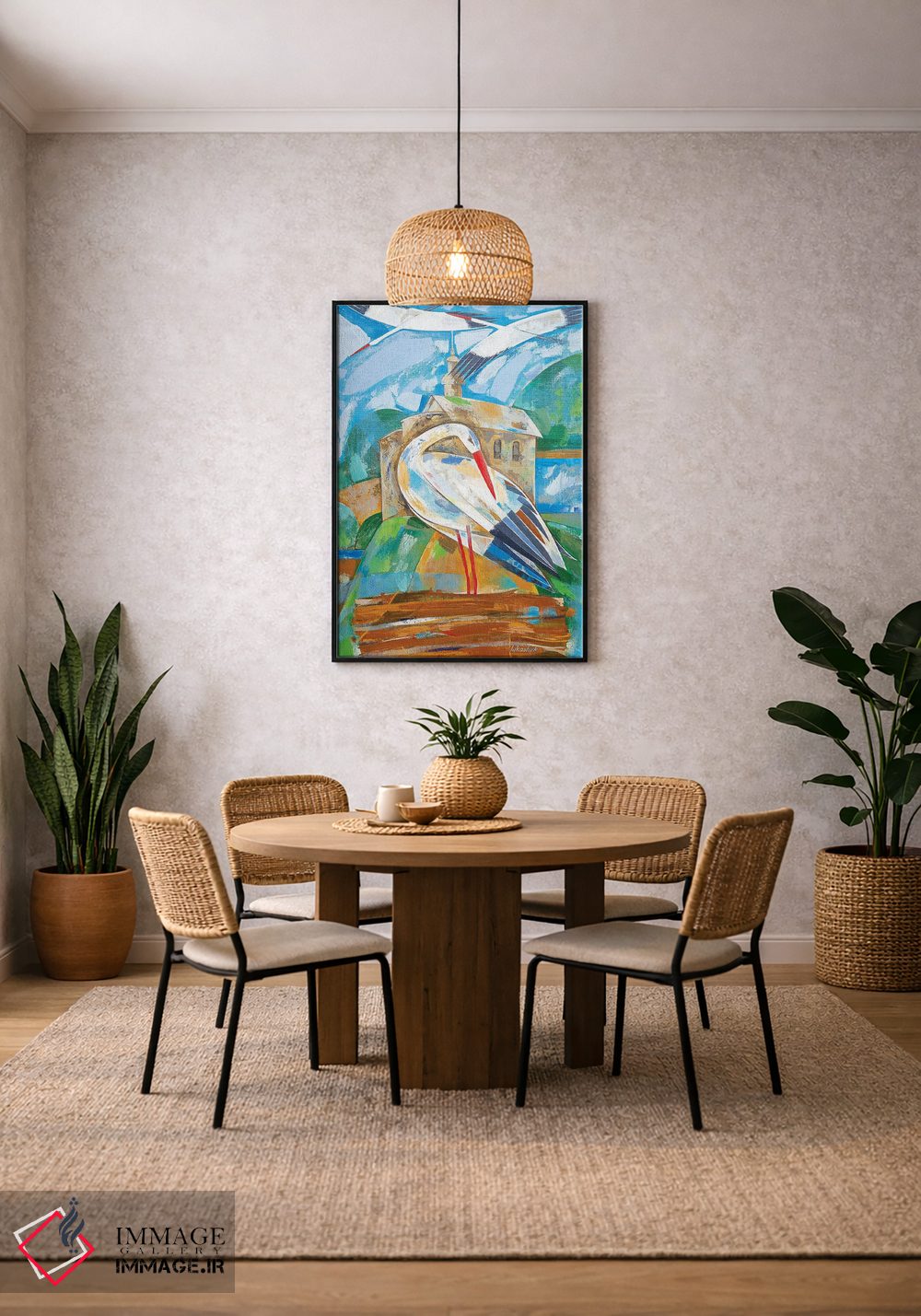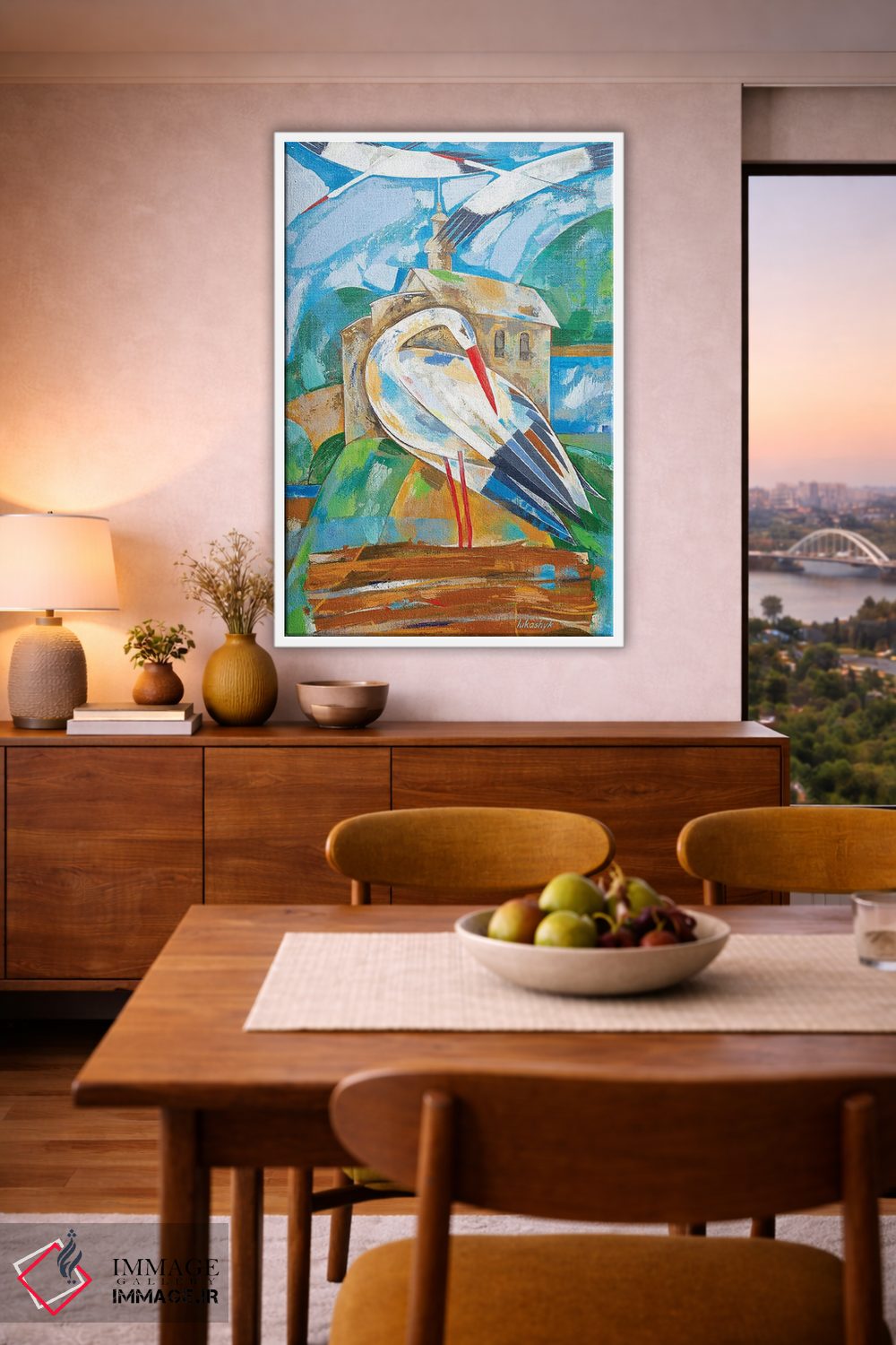 در «لکلکها» اثرِ «نِلی لوکاشیک»، حضور حیوانات به فضا، گرمیِ ملایم اضافه میکند؛ برای دیوار کنار میز کار انتخابی خوشسلیقه است. هم فضا را گرم میکند، هم شلوغش نمیکند.
