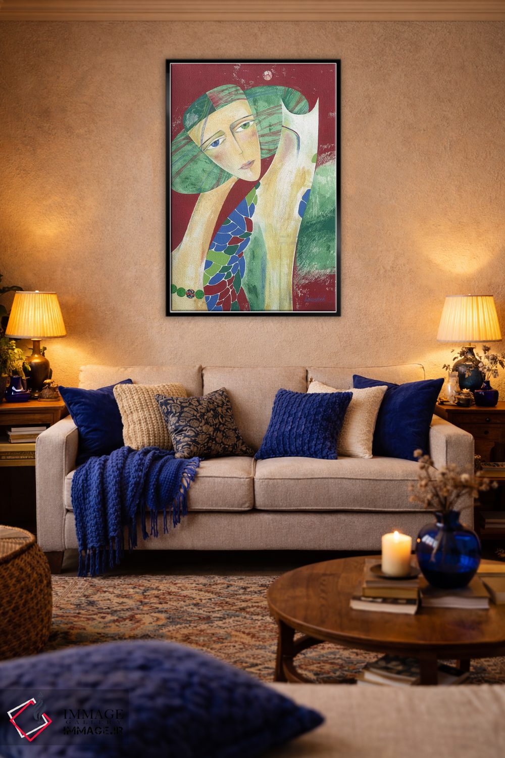براساس پالت ترکیبی اثر، قاب بلوط روشن (چوبی) پیشنهاد اول است و استخوانی ملایم مکمل. برای سفارشهای پروژهای با ابعاد و قابهای اختصاصی با ایماژ در تماس باشید.
