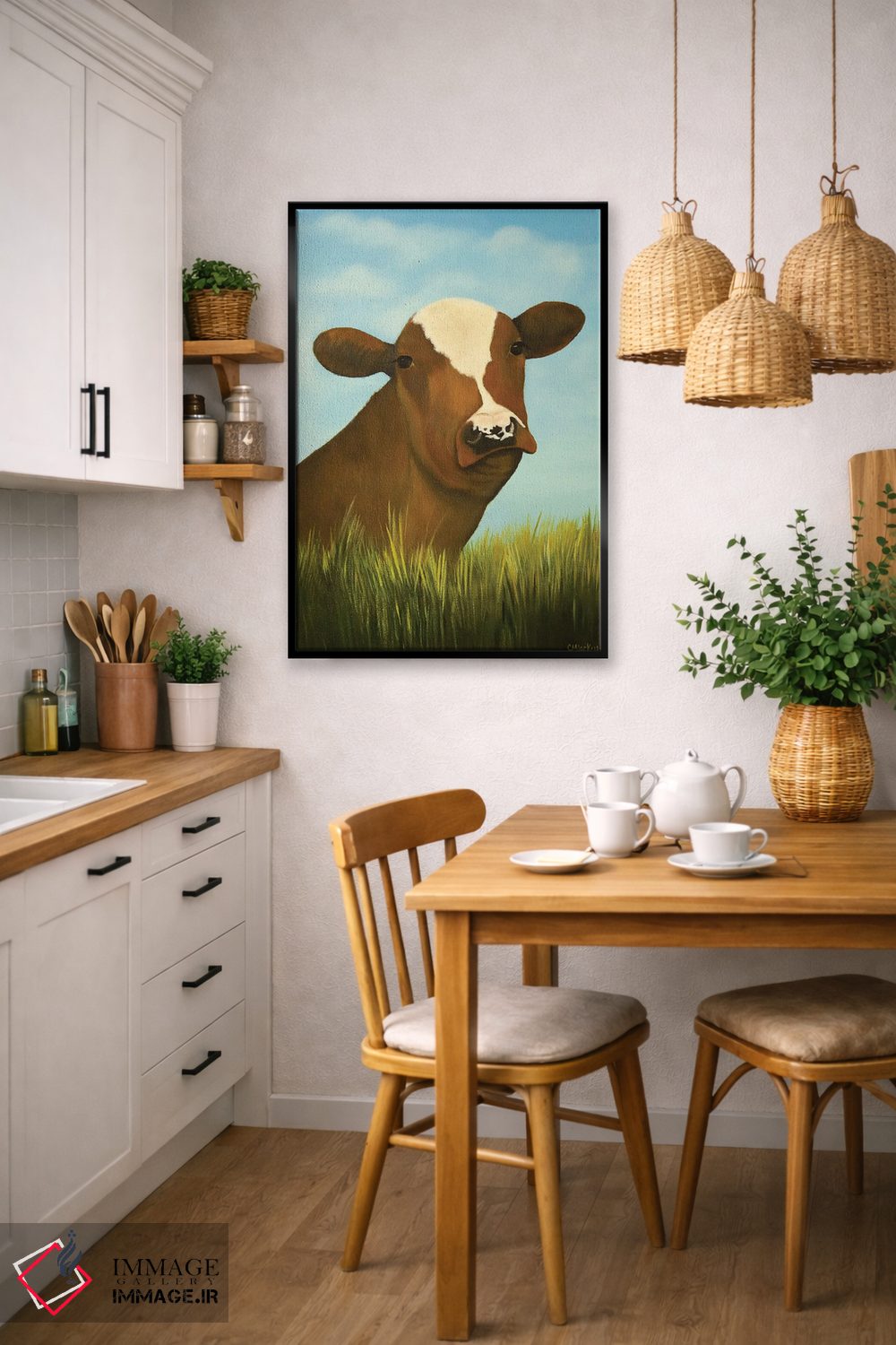براساس پالت ترکیبی اثر، قاب تیک گرم (چوبی) پیشنهاد اول است و مشکی مات (فریم متوسط) مکمل. برای سفارشهای پروژهای با ابعاد و قابهای اختصاصی با ایماژ در تماس باشید.