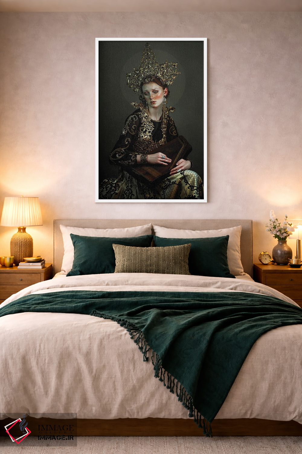براساس پالت گرم اثر، قاب بلوط روشن (چوبی) پیشنهاد اول است و استخوانی ملایم مکمل. برای سفارشهای پروژهای با ابعاد و قابهای اختصاصی با ایماژ در تماس باشید.