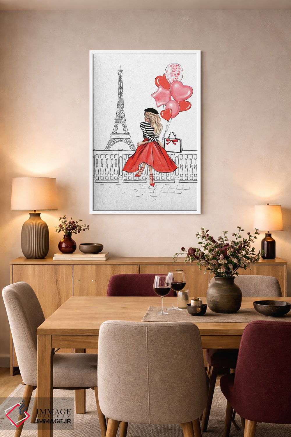 ساختار بوم گالری ایماژ طوری است که اثر روی دیوار «پرداختشده» و حرفهای دیده شود—نه پرزرقوبرقِ بیپایه؛ بلکه دقیق و خوشپرداخت. با بافت ظریف کنواس، حس اثر هنری را در نگاه نزدیک نگه میدارد و برای محیطهای رسمیتر هم انتخاب مطمئنی است. در چاپ جیکلی (Giclée)، گذارهای رنگی را نرمتر میکند بهخصوص وقتی نور موضعی ملایم داشته باشید. حاصل کار، یک تابلو خوشنشین است که هم از دور اثرگذار است و هم از نزدیک خوشخوان؛ اگر فضا کمینهگرا است، همین پرداخت تمیز کافی است.