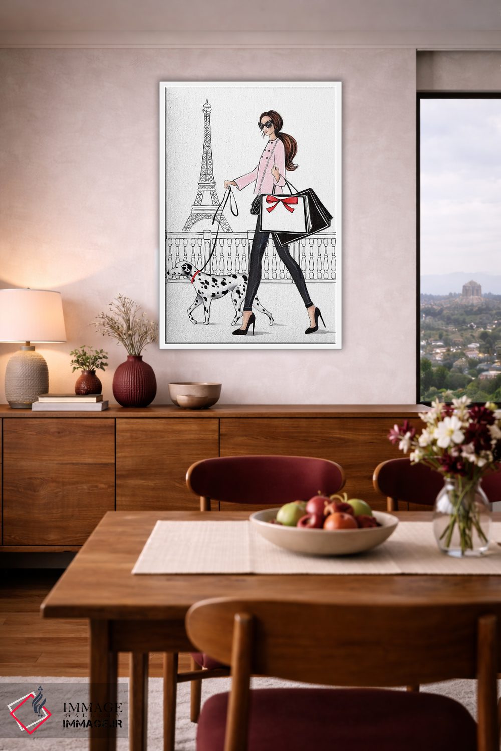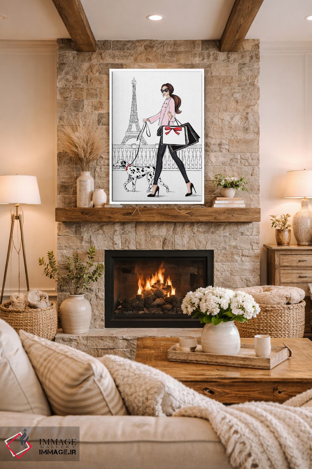 برای دیوارهای ساده، «دختر مو قهوهای با سگ دالمیشن در پاریس» اثرِ «لالانا آرتس (استودیو هنری)» یک لبخند ریز به چیدمان میدهد؛ برای نشیمنهای خانوادگی انتخابی خوشسلیقه است. هم فضا را گرم میکند، هم شلوغش نمیکند.