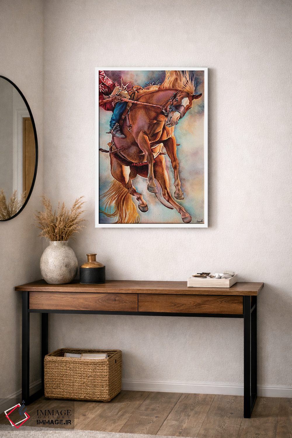 براساس پالت گرم اثر، قاب تیک گرم (چوبی) پیشنهاد اول است و مشکی مات (فریم متوسط) مکمل. برای سفارشهای پروژهای با ابعاد و قابهای اختصاصی با ایماژ در تماس باشید.