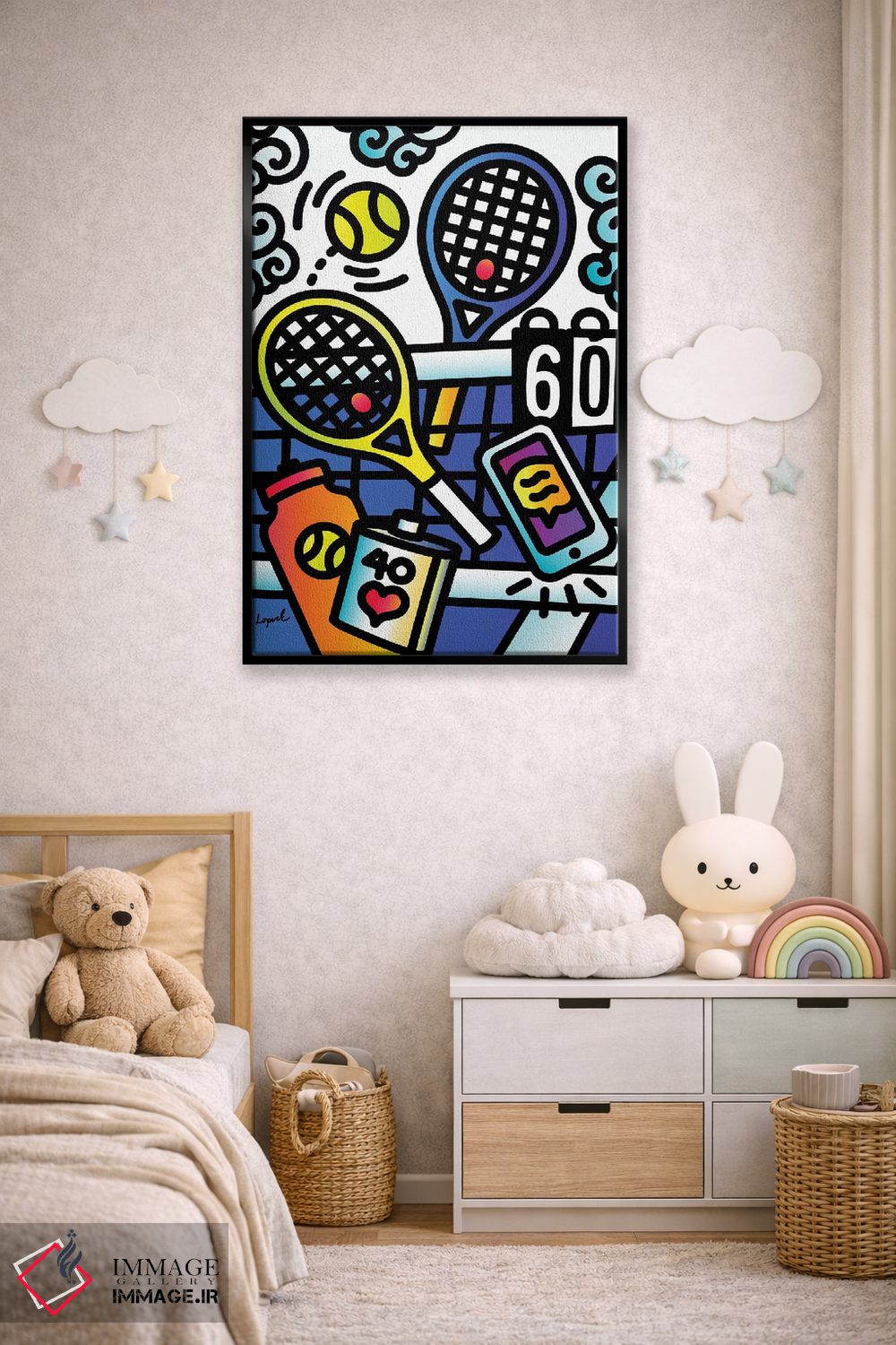 براساس پالت ترکیبی اثر، قاب تیک گرم (چوبی) پیشنهاد اول است و مشکی مات (فریم متوسط) مکمل. برای سفارشهای پروژهای با ابعاد و قابهای اختصاصی با ایماژ در تماس باشید.