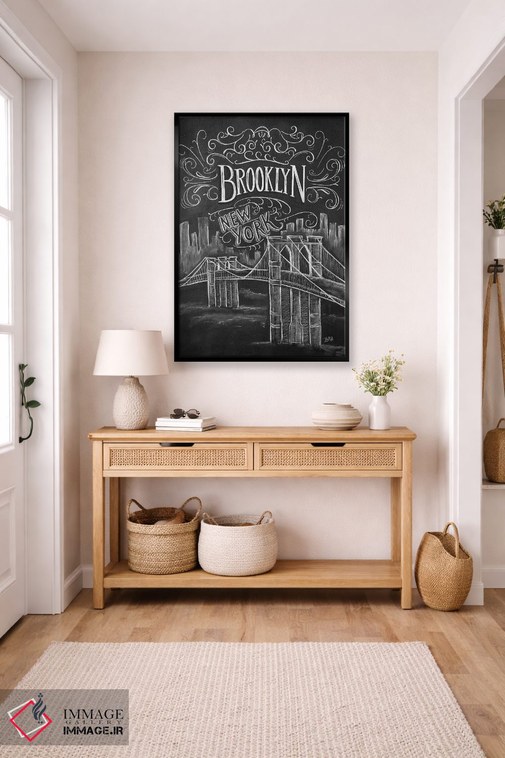 برای دکورهای ساختارمند و مدرن، «پل بروکلین» اثرِ «لیلی و ول (برند کارت و هنر)» حس نظم و استحکام به فضا بدهد؛ برای راهروهای شیک انتخابی خوشسلیقه است. جزئیاتش از نزدیک هم خواناست و خوشپرداخت.