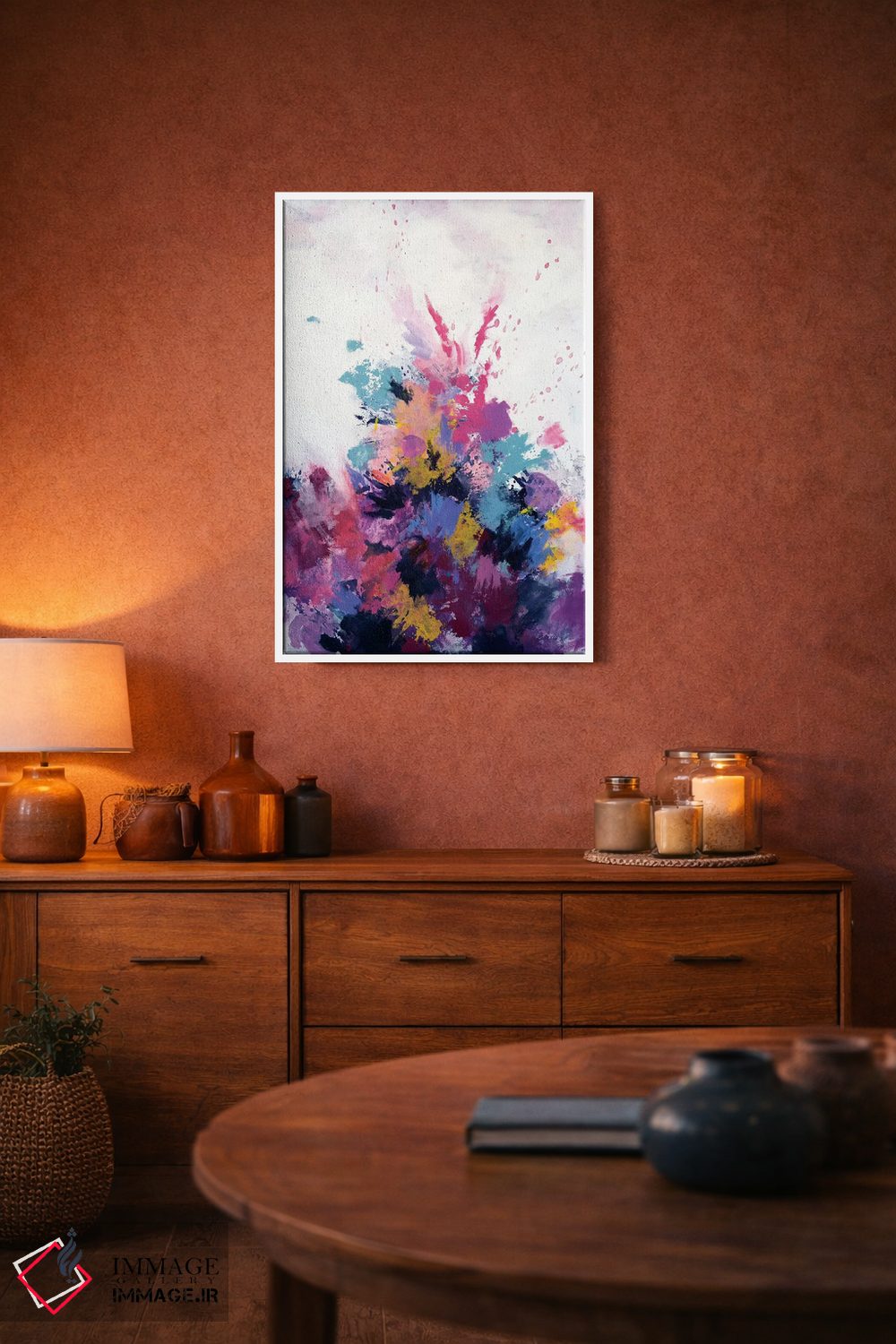 براساس پالت ترکیبی اثر، قاب تیک گرم (چوبی) پیشنهاد اول است و مشکی مات (فریم متوسط) مکمل. برای سفارشهای پروژهای با ابعاد و قابهای اختصاصی با ایماژ در تماس باشید.