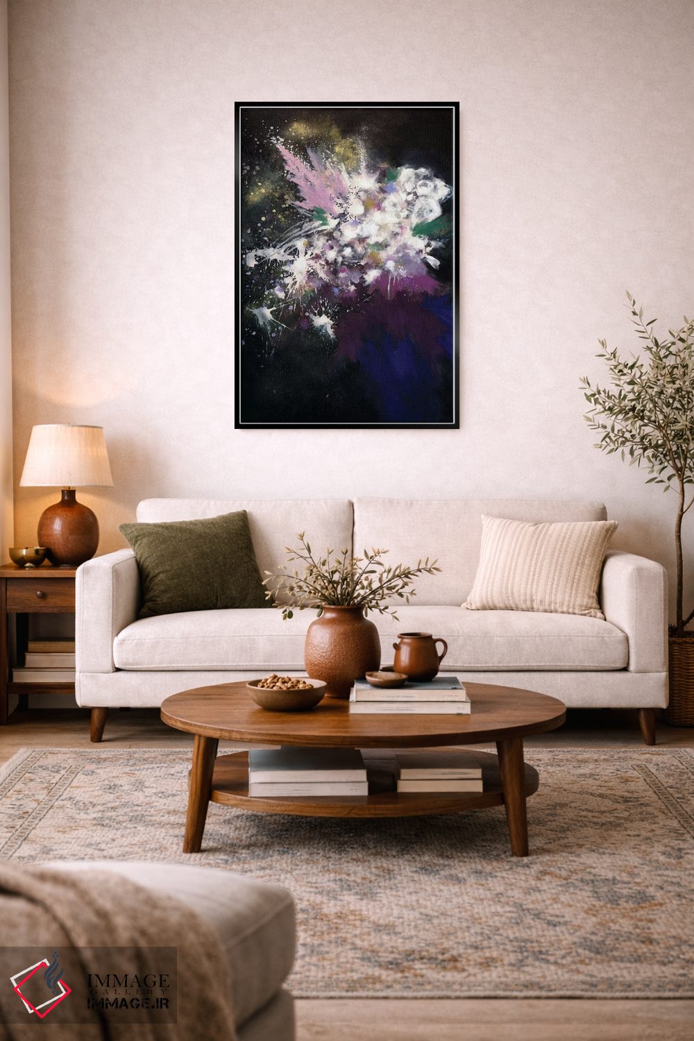 براساس پالت ترکیبی اثر، قاب تیک گرم (چوبی) پیشنهاد اول است و مشکی مات (فریم متوسط) مکمل. برای سفارشهای پروژهای با ابعاد و قابهای اختصاصی با ایماژ در تماس باشید.