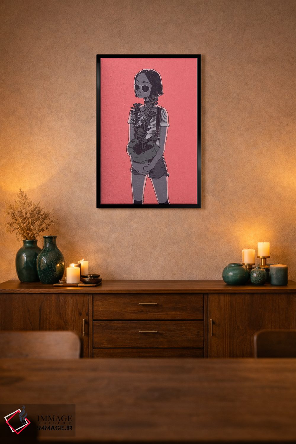 براساس پالت گرم اثر، قاب تیک گرم (چوبی) پیشنهاد اول است و مشکی مات (فریم متوسط) مکمل. برای سفارشهای پروژهای با ابعاد و قابهای اختصاصی با ایماژ در تماس باشید.