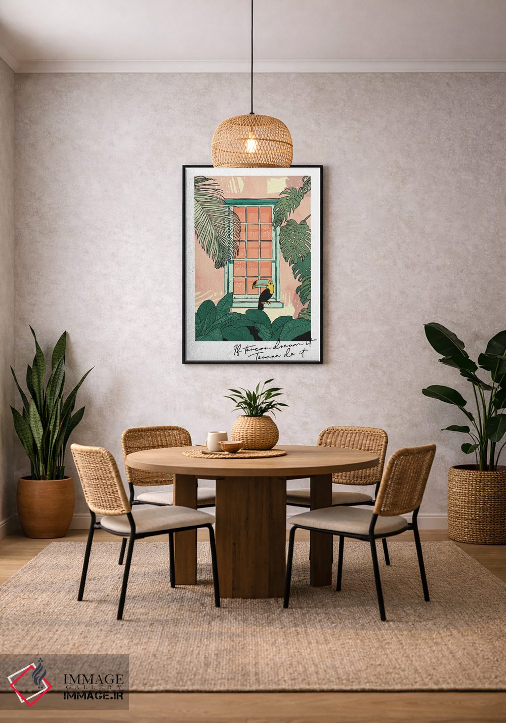 براساس پالت ترکیبی اثر، قاب بلوط روشن (چوبی) پیشنهاد اول است و استخوانی ملایم مکمل. برای سفارشهای پروژهای با ابعاد و قابهای اختصاصی با ایماژ در تماس باشید.