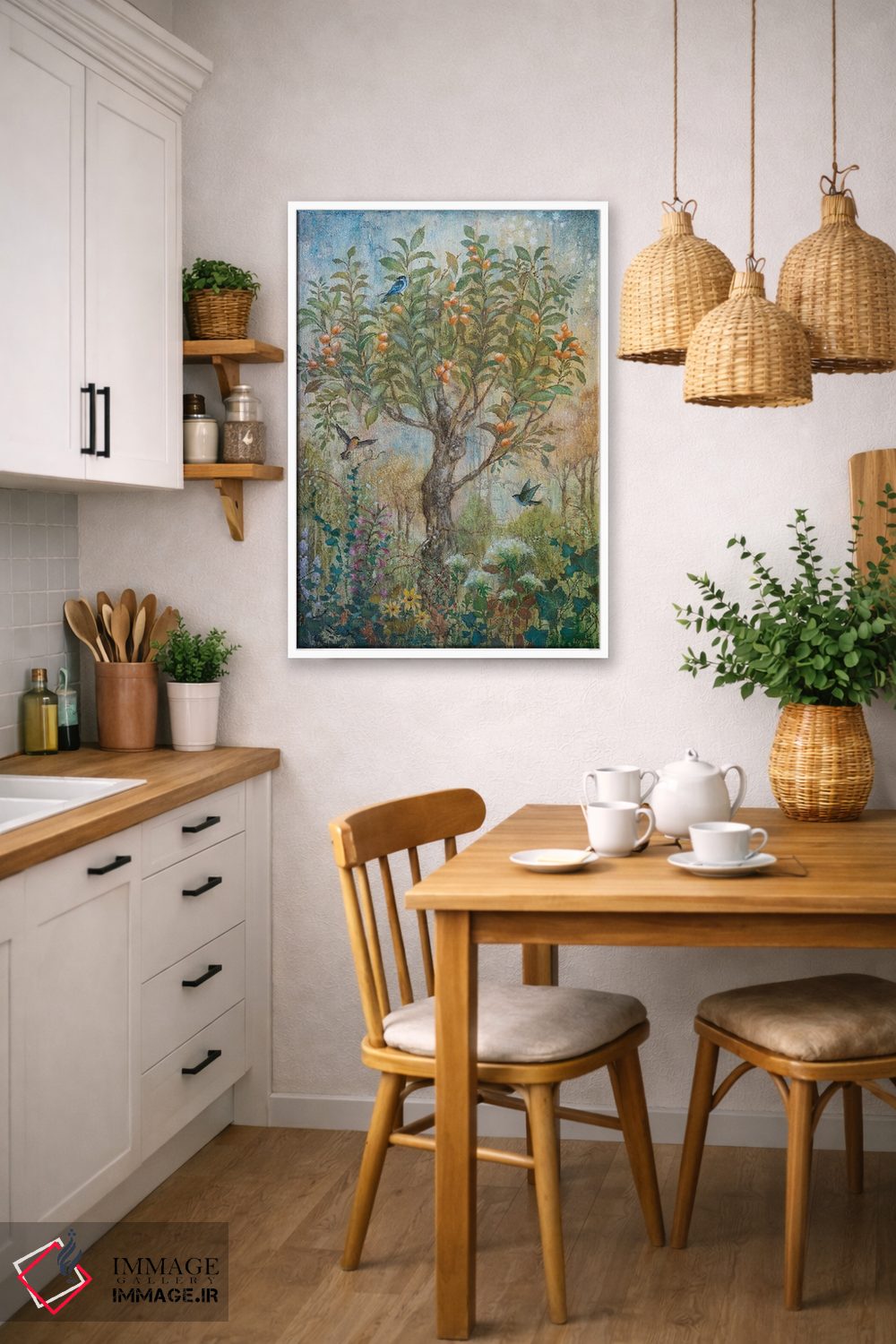 این تابلو با عنوان «افسون زردآلو» اثرِ «لیزا مری کیندلی»، حسِ گرم و صمیمی به فضا میدهد.