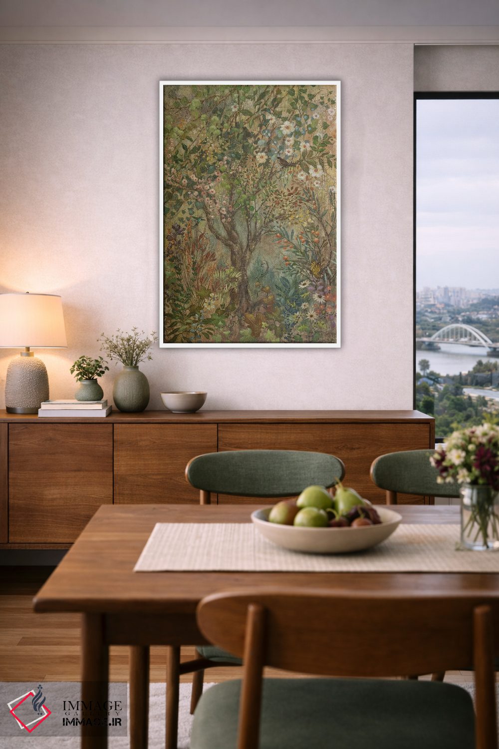 براساس پالت ترکیبی اثر، قاب بلوط روشن (چوبی) پیشنهاد اول است و استخوانی ملایم مکمل. برای سفارشهای پروژهای با ابعاد و قابهای اختصاصی با ایماژ در تماس باشید.