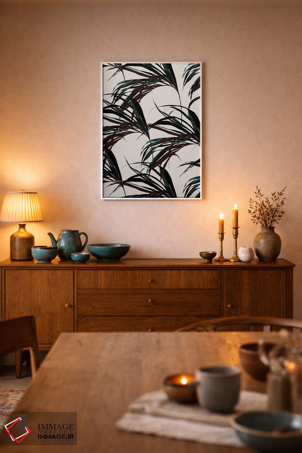 براساس پالت ترکیبی اثر، قاب تیک گرم (چوبی) پیشنهاد اول است و مشکی مات (فریم متوسط) مکمل. برای سفارشهای پروژهای با ابعاد و قابهای اختصاصی با ایماژ در تماس باشید.