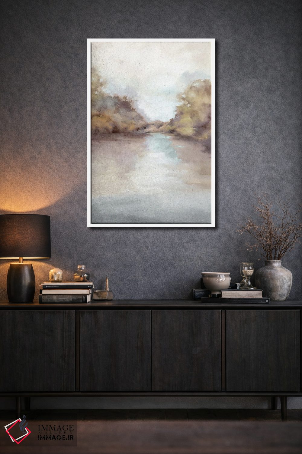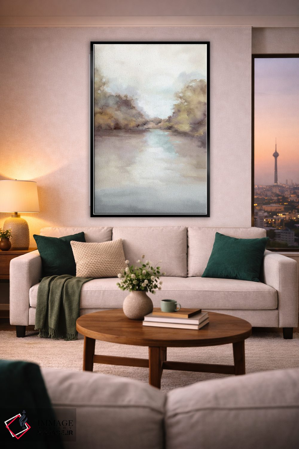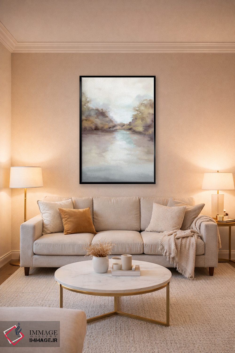 براساس پالت گرم اثر، قاب بلوط روشن (چوبی) پیشنهاد اول است و استخوانی ملایم مکمل. برای سفارشهای پروژهای با ابعاد و قابهای اختصاصی با ایماژ در تماس باشید.