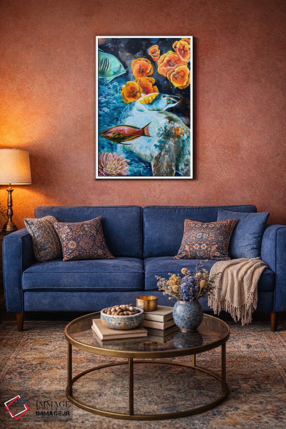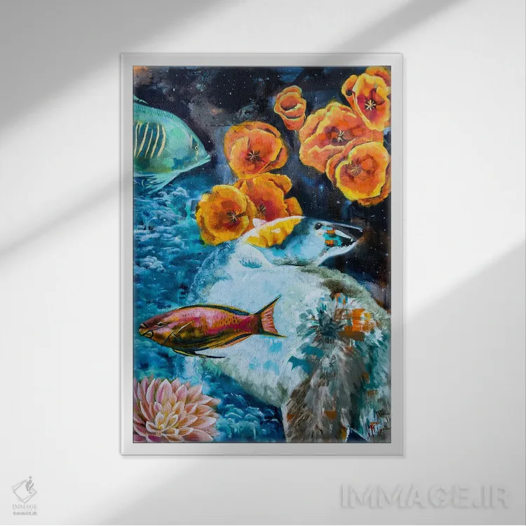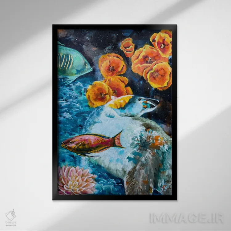 براساس پالت ترکیبی اثر، قاب تیک گرم (چوبی) پیشنهاد اول است و مشکی مات (فریم متوسط) مکمل. برای سفارشهای پروژهای با ابعاد و قابهای اختصاصی با ایماژ در تماس باشید.