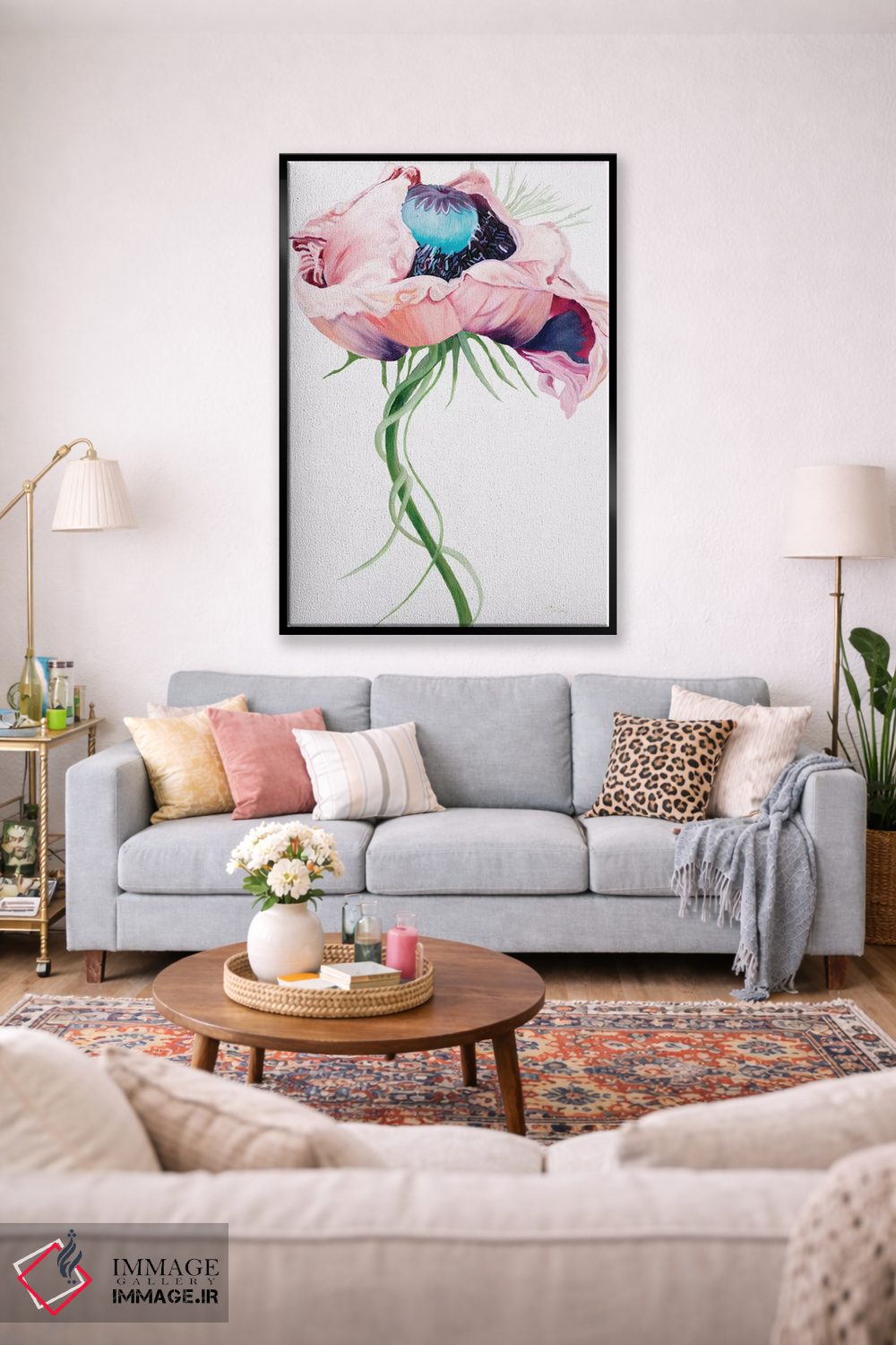 اگر دوست دارید هماهنگی کاملتر شود، رنگِ صورتی را در یک گلدان کمینهگرا برگردانید تا ترکیببندی قویتر شود. انتخاب قاب هم میتواند این اکسنت را تقویت کند.