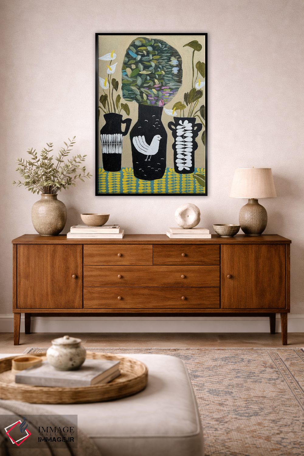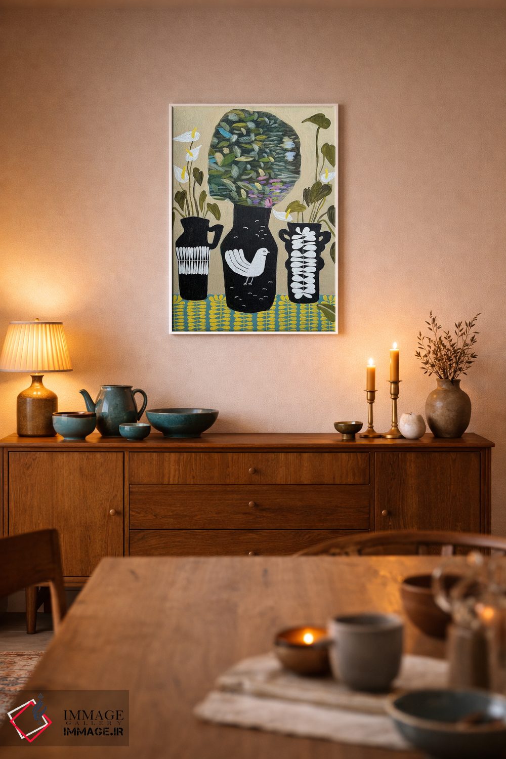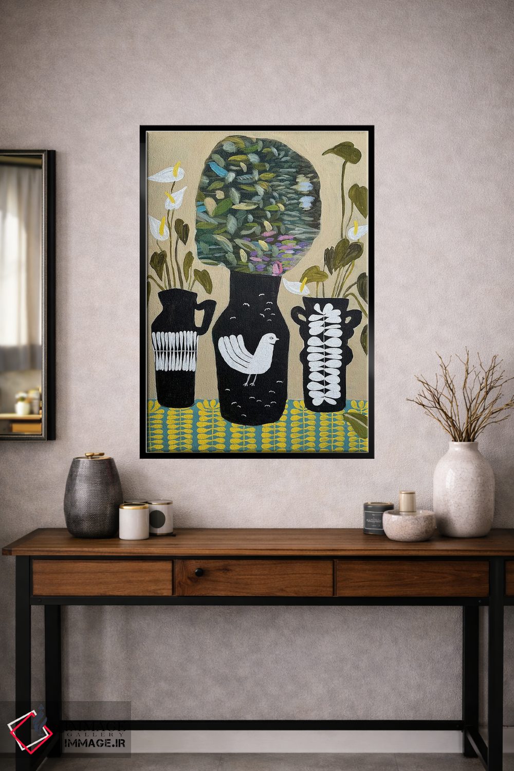 براساس پالت ترکیبی اثر، قاب بلوط روشن (چوبی) پیشنهاد اول است و استخوانی ملایم مکمل. برای سفارشهای پروژهای با ابعاد و قابهای اختصاصی با ایماژ در تماس باشید.