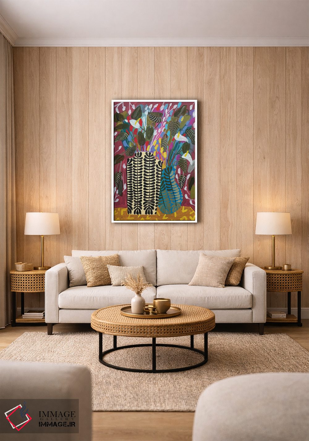 براساس پالت ترکیبی اثر، قاب تیک گرم (چوبی) پیشنهاد اول است و مشکی مات (فریم متوسط) مکمل. برای سفارشهای پروژهای با ابعاد و قابهای اختصاصی با ایماژ در تماس باشید.