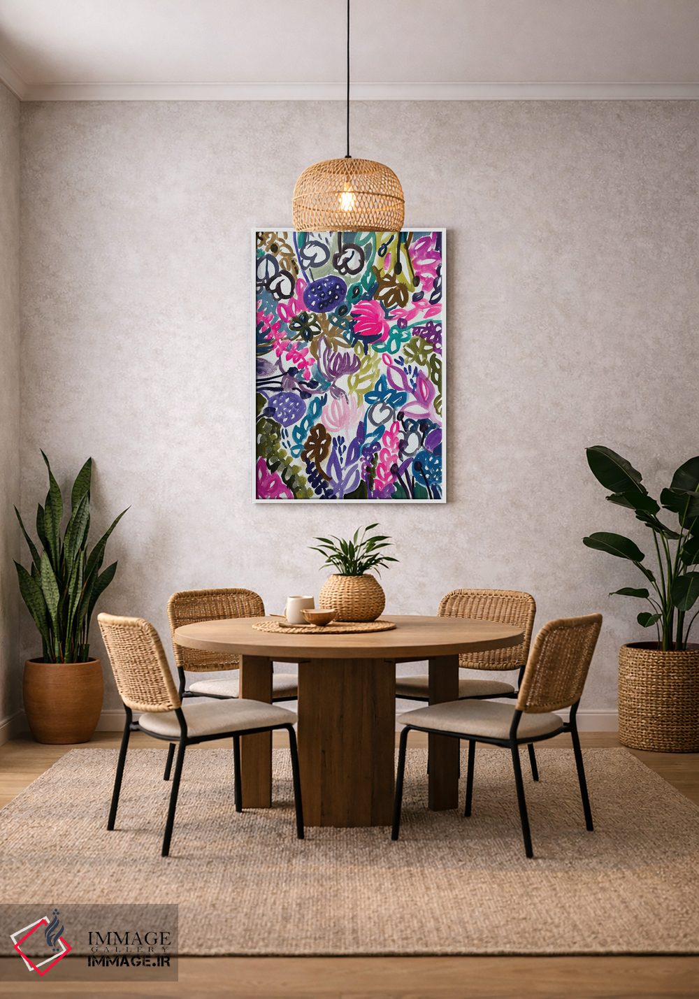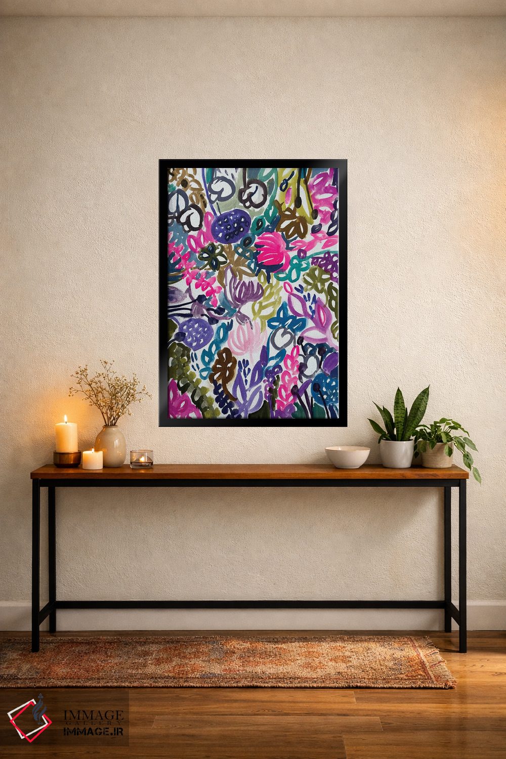 طراحی بوم گالری ایماژ بهگونهای است که اثر روی دیوار «پرداختشده» و حرفهای دیده شود—نه پرزرقوبرقِ بیپایه؛ بلکه دقیق و خوشپرداخت. با بافت ظریف کنواس، حس اثر هنری را در نگاه نزدیک نگه میدارد بدون اغراق؛ فقط دقیقتر. قابپذیری کمک میکند هماهنگی قاب با پالت رنگ جلوه را تقویت میکند. در نهایت، نتیجه چیزی شبیه تفاوت نسخهی معمولی با نسخهی باکیفیتتر است: نه رنگِ بیشتر، بلکه پرداخت بهتر.