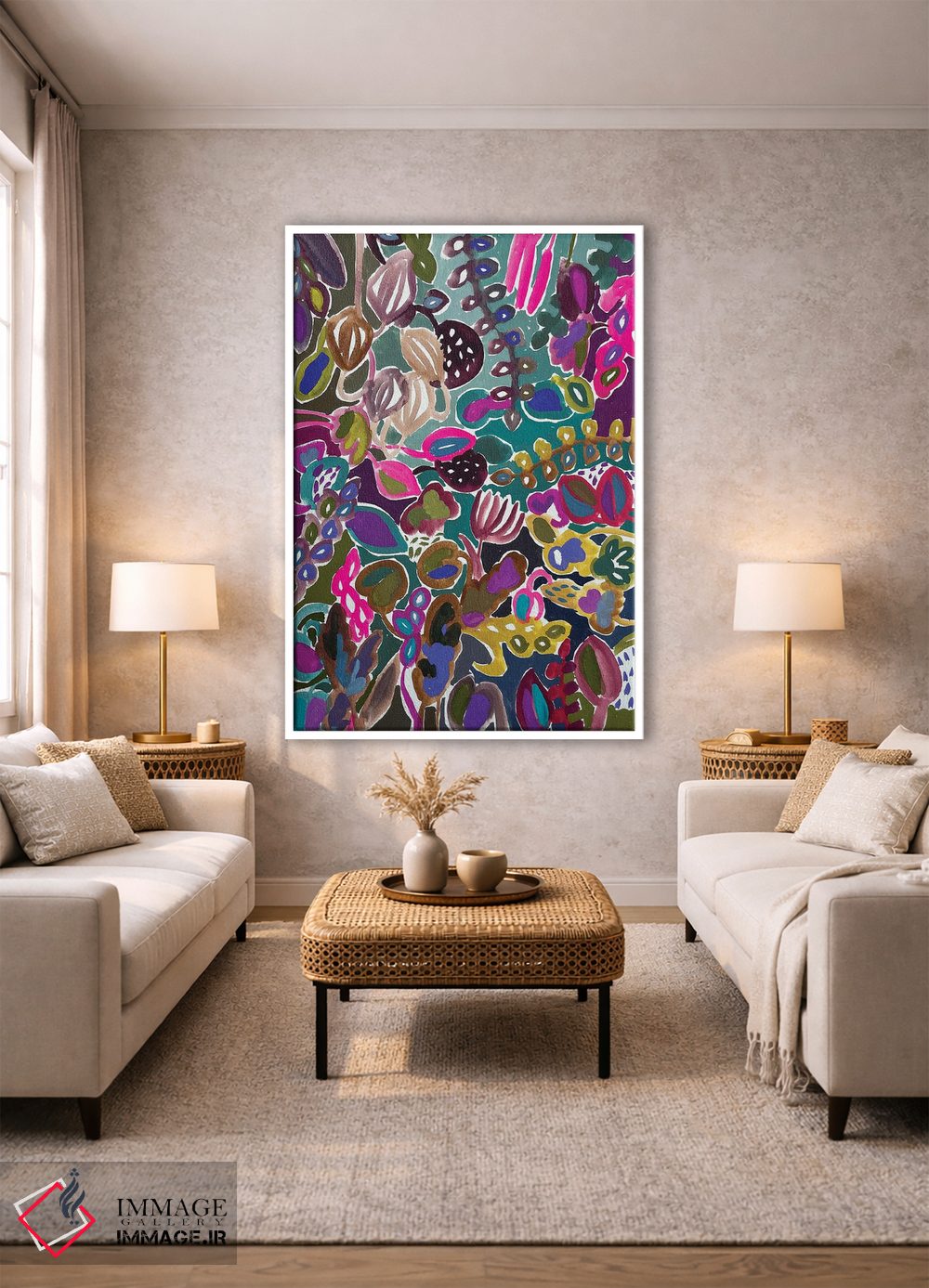 بوم گالری ایماژ نسخهی چیدماناتیوِ حرفهای از یک اثر هنری است؛ روی کنواس سفیدِ یکدست و بدون اسید با چاپ هنری به استاندارد جیکلی (Giclée) با سیستم رنگ Epson UltraChrome HDR برای نیمسایههای نرمتر و سایههای جزئیتر؛ روی دیوار، کار یکدستتر و خوشکیفیتتر دیده میشود. اسمبل تمیز و آمادهی نصب؛ کشیدگی استاندارد روی کلاف و یراق مناسب.